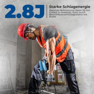 - 800 Watt Motor mit 2,8 J Schlagenergie für harte Materialien: Bohrt sich durch Beton, Mauerwerk und Stein bis 26 mm Durchmesser – ausreichend für Standarddübel, Rohrleitungen und Elektroinstallationen
