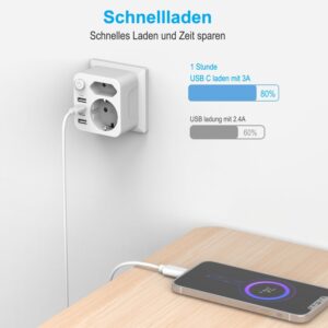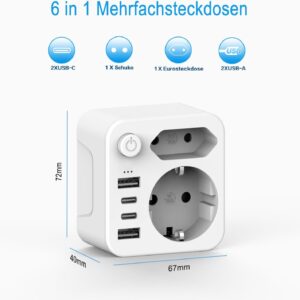 Ein USB-Steckdosenadapter ist ein praktischer Aufsatz für Ihre vorhandene Wandsteckdose, der diese um zusätzliche Anschlüsse erweitert. Dieses Modell bietet Ihnen nach dem Einstecken in eine deutsche Schutzkontaktsteckdose eine Schuko-Steckdose, eine Euro-Steckdose sowie zwei C-Typ- und zwei USB-Anschlüsse. Damit können Sie bis zu 6 Geräte gleichzeitig effizient betreiben oder aufladen.