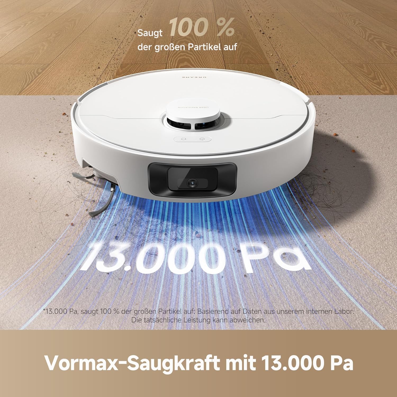 Der Dreame D20 Pro Plus bietet eine beeindruckende Saugkraft von 13.000 Pa. Diese hohe Leistung ermöglicht eine gründliche Reinigung verschiedenster Bodenbeläge und entfernt selbst hartnäckigen Schmutz zuverlässig. Trotz dieser starken Saugkapazität bleibt das Gerät effizient in seiner Arbeitsweise.