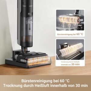 Der H12 Pro Ultra verfügt über ein fortschrittliches Selbstreinigungssystem mit 60 °C heißem Wasser, das die Bürste sterilisiert und Ölflecken sowie Bakterien entfernt. Anschließend trocknet Heißluft die Bürste vollständig, um unangenehme Gerüche zu verhindern. Die Bürste rotiert dabei in beide Richtungen und ein fester Schaber im Kammzahn-Design entfernt Haare automatisch.