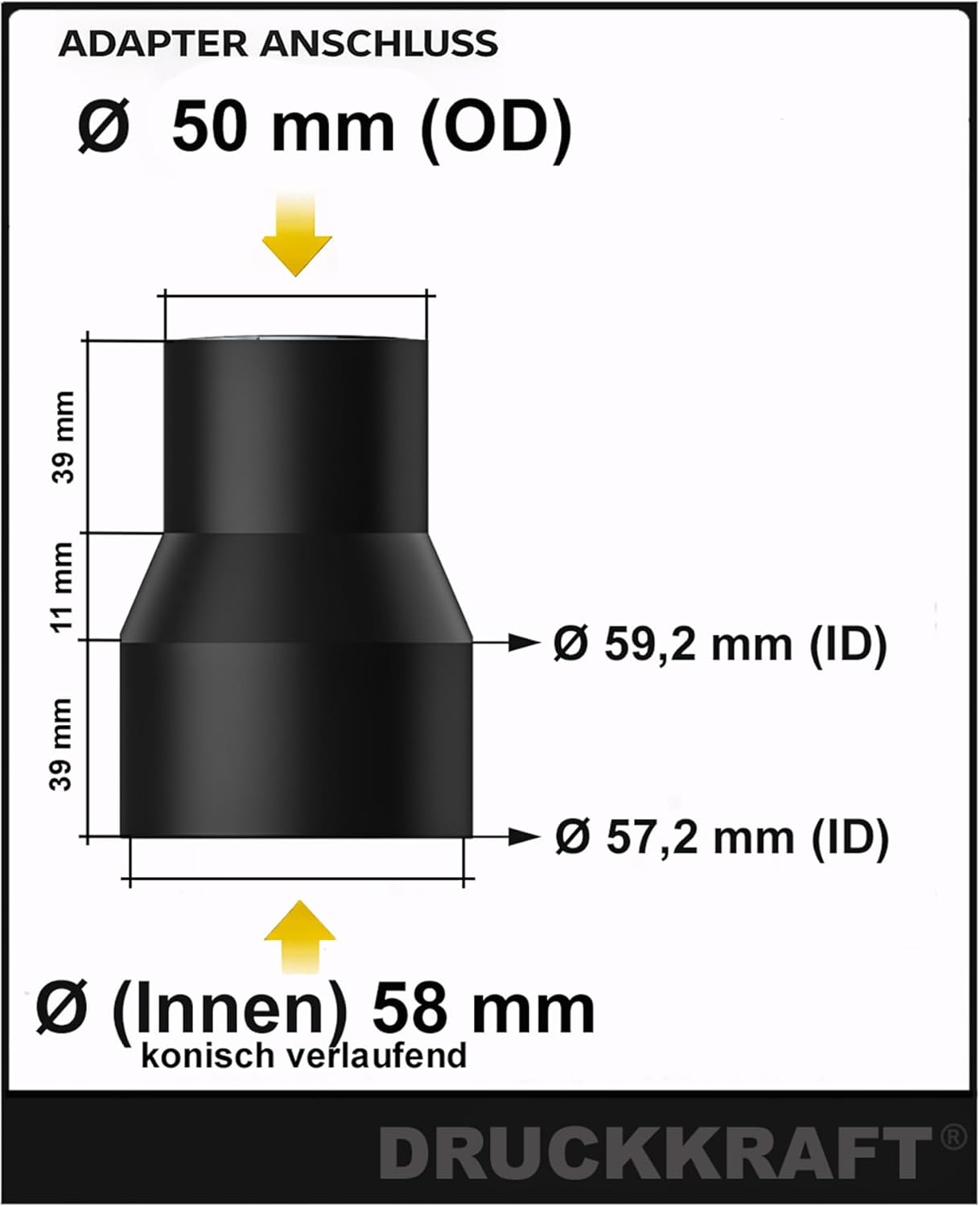 Das DRUCKKRAFT Reduzierstück 50 mm auf 58 mm ist die passgenaue Lösung für alle, die in ihrer Werkstatt Ordnung in das Absaugsystem bringen wollen. Es richtet sich an ambitionierte Heimwerker und Profis, die regelmäßig zwischen verschiedenen Maschinenanschlüssen und standardisierten DN50 HT-Rohren wechseln müssen.