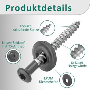 Die EPDM-Dichtscheibe sorgt für einen effektiven Schutz gegen das Eindringen von Feuchtigkeit und Schmutz in das Bohrloch. Zudem ermöglicht sie eine bessere Kraftverteilung bei der Befestigung, was die Stabilität der Verbindung selbst bei langfristigem Einsatz im Außenbereich erhöht.