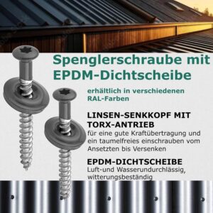 Die DSM Spenglerschrauben in Anthrazit (RAL 7016) sind die erste Wahl für Profi-Dachdecker, Fassadenbauer und anspruchsvolle Heimwerker. Durch die Kombination aus korrosionsbeständigem Edelstahl A2 und einer hochwertigen EPDM-Dichtscheibe gewährleisten diese Schrauben eine dauerhaft witterungsfeste und optisch ansprechende Befestigung von Blechen und Profilen.