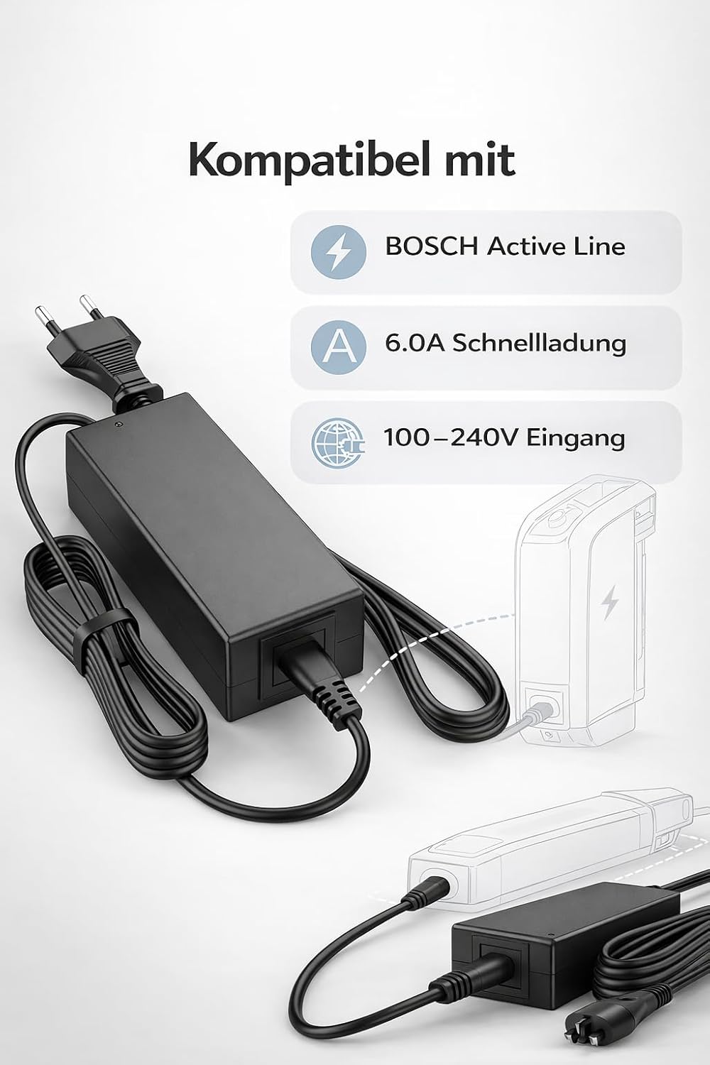 Ja, dieses Ladegerät ist mit allen 36V Bosch Akkus der Performance Line und Active Line kompatibel. Das Gerät arbeitet mit einer Ausgangsspannung von 42V und einer Stromstärke von 6A, was ein effizientes Laden Ihres Akkus ermöglicht.