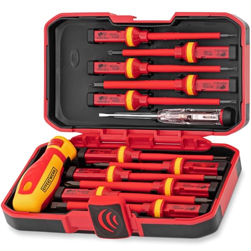 Effektwerk - 13-teiliges Elektriker-Schraubendreher-Set - 4 Schlitz-, 3 Torx-, 2 PoziDriv-, 2 Phillips-Schraubendreher mit Spannungsprüfer - 1000V isoliert und VDE-geprüft mit MagnetspitzenEffektwerk – 13-teiliges Elektriker-Schraubendreher-Set – 4 Schlitz-, 3 Torx-, 2 PoziDriv-, 2 Phillips-Schraubendreher mit Spannungsprüfer – 1000V isoliert und VDE-geprüft mit Magnetspitzen