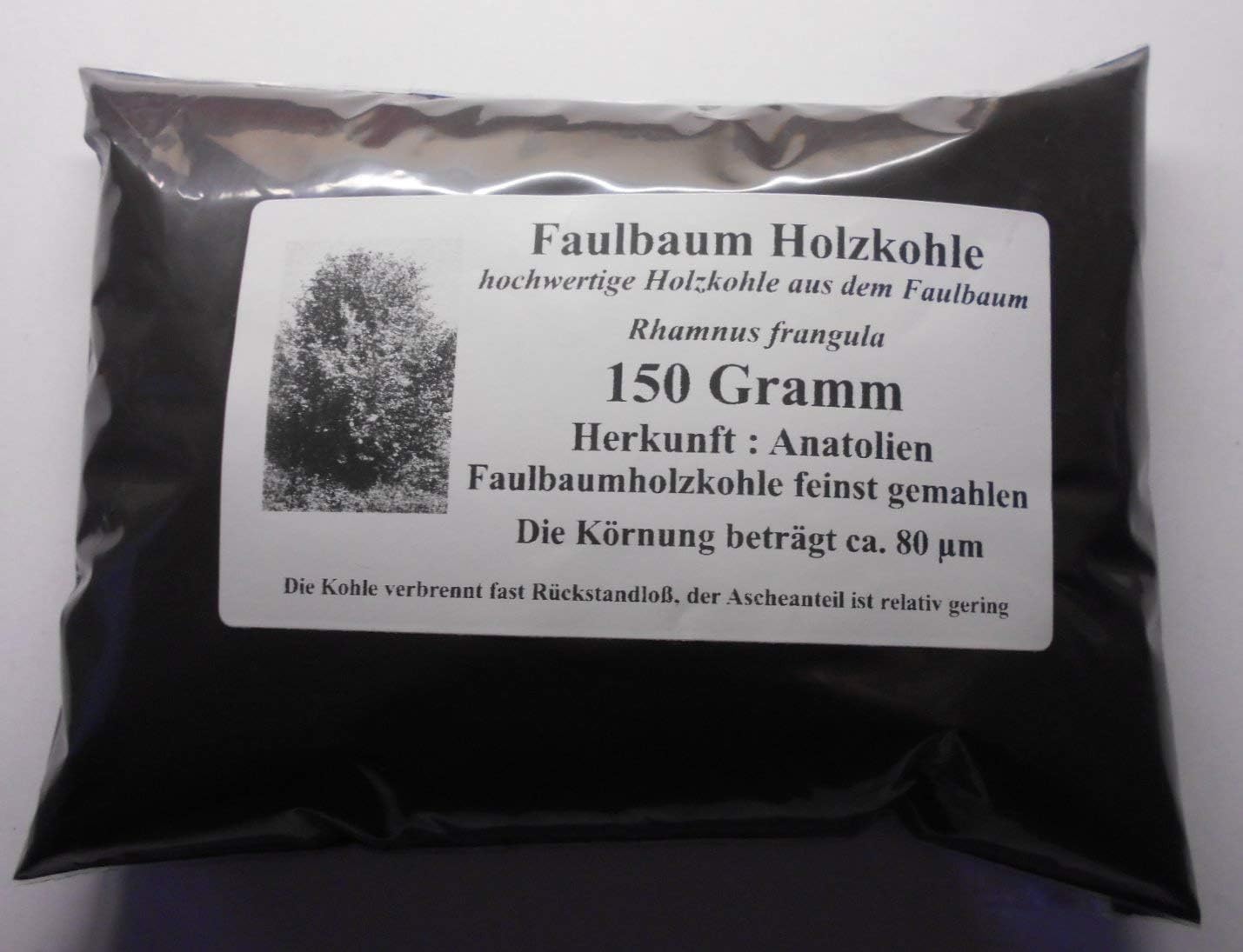 Produktbeschreibungen 150 g Holzkohlenstaub vom Faulbaum (Rhamnus frangula) Faulbaumholzkohle feinst gemahlen Die Körnung beträgt ca 80 µm (Bild 2) Die Kohle verbrennt fast Rückstandlos mit geringem Ascheanteil (auch in anderen Verpackungseinheiten 250 – 500 – 1000 Gramm erhältlich siehe Angebote im Shop) Rechtliche Hinweise Versand: Die Faulbaumholzkohle wird in einem doppelten, widerverschließbaren, luftdichten PTFE Beuteln sicher verpackt geliefert