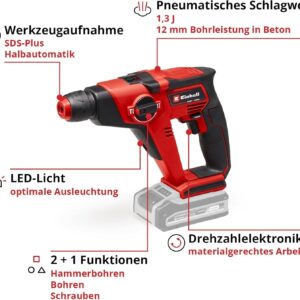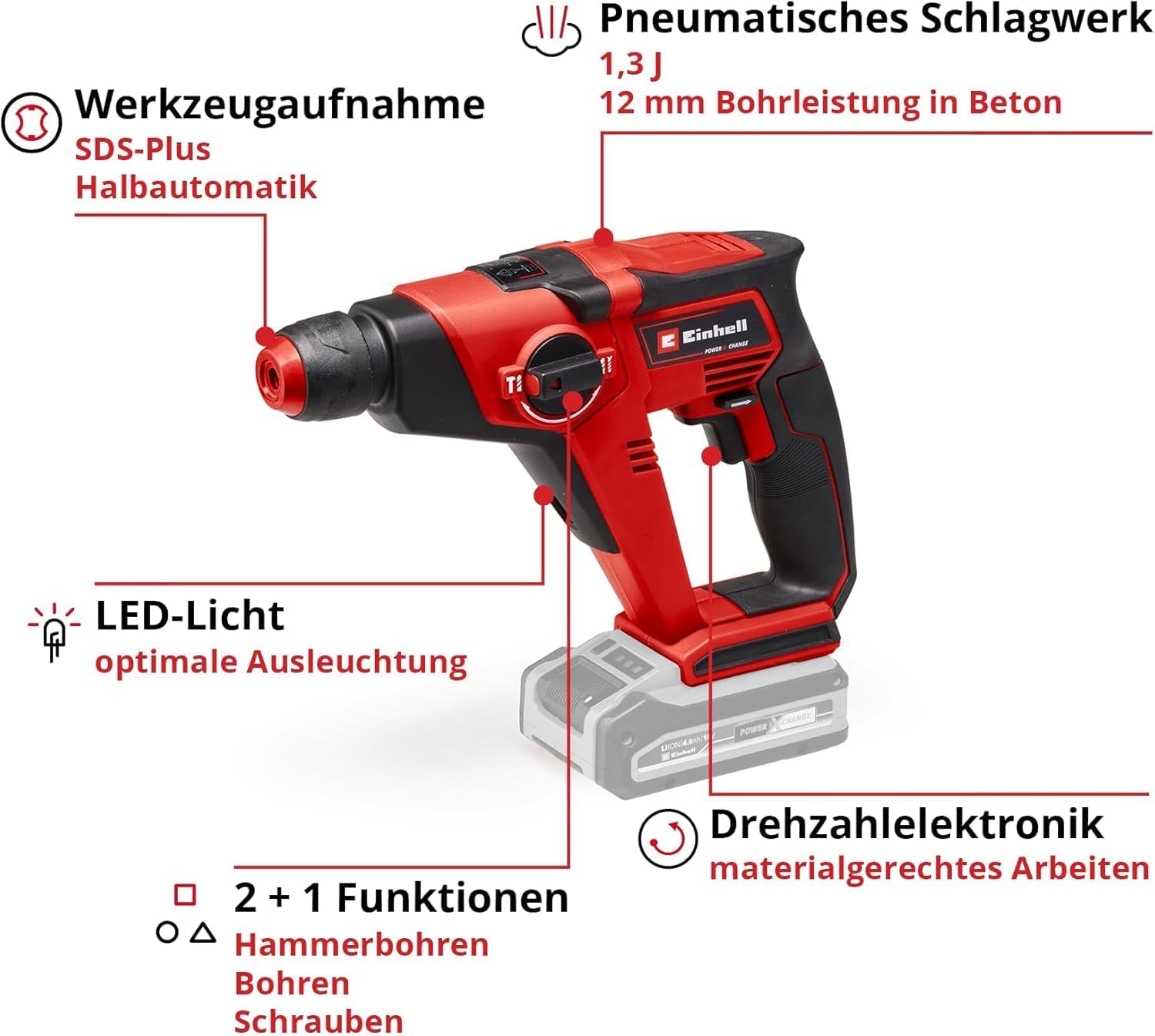 Einhell Akku-Bohrhammer TE-HD 18/12 Li-Solo Power X-Change (Lithium-Ionen, 18 V, 1,3 J, Bohrleistung in Beton 12 mm, SDS-plus-Aufnahme, LED-Licht, ohne Akku und Ladegerät)Einhell Akku-Bohrhammer TE-HD 18/12 Li-Solo Power X-Change (Lithium-Ionen, 18 V, 1,3 J, Bohrleistung in Beton 12 mm, SDS-plus-Aufnahme, LED-Licht, ohne Akku und Ladegerät)