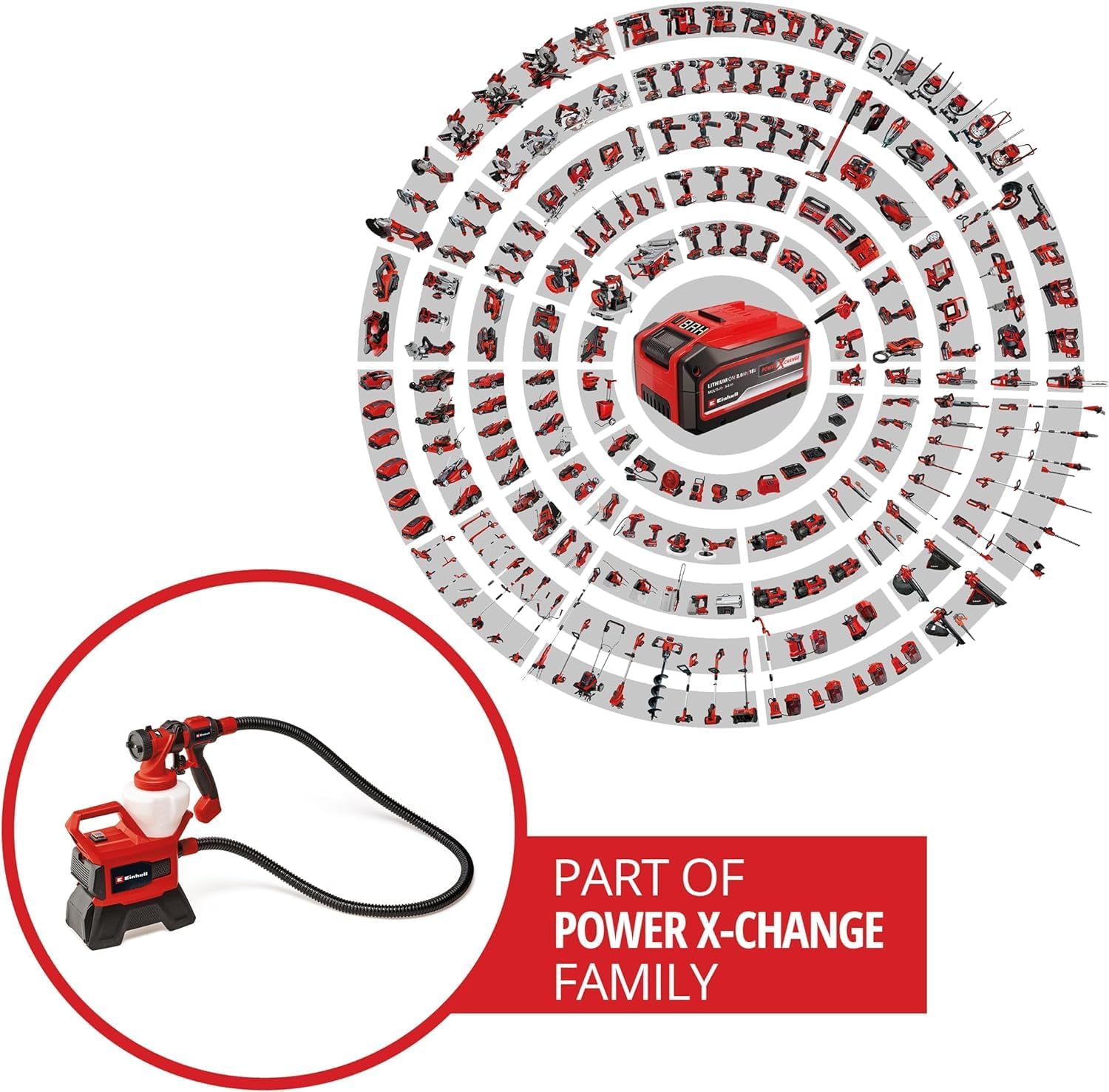 Das Einhell Akku-Farbsprühsystem TE-SY 18/90 Li-Solo ist Teil der Power X-Change Familie. Dies bedeutet, dass alle Akkus und Ladegeräte aus diesem System flexibel miteinander kombiniert sowie für dieses Gerät genutzt werden können.