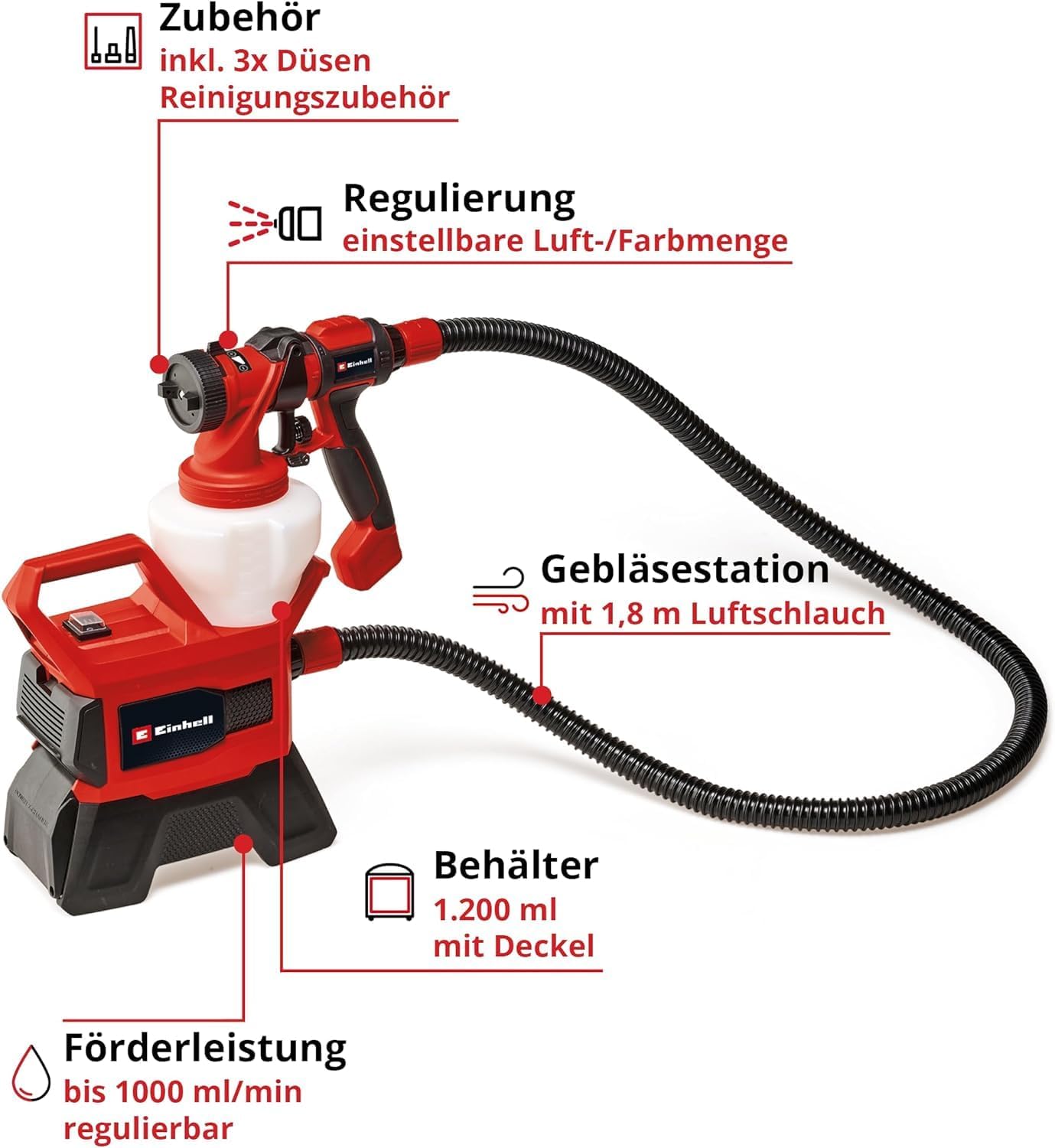 - Hohe Reichweite durch 1200 ml Behälter: Der großzügig bemessene Farbbehälter reduziert Nachfüllpausen und erlaubt unterbrechungsfreies Arbeiten bei umfangreichen Projekten.