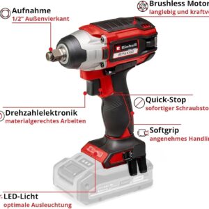 Der Einhell IMPAXXO 18/230 kombiniert moderne Brushless-Technologie mit durchdachter Ergonomie. Der wartungsfreie PurePOWER-Motor arbeitet ohne Verschleißteile und liefert konstante Leistung über die gesamte Akkulaufzeit. Im Vergleich zu Kohlebürstenmotoren bedeutet das längere Einsatzzeiten pro Akkuladung und keine Leistungseinbußen durch abgenutzte Bürsten. Das kraftvolle Getriebe überträgt 230 Nm Drehmoment auf die 1/2 Zoll Vierkantaufnahme – ausreichend für die allermeisten Schraubarbeiten in Werkstatt und auf der Baustelle.