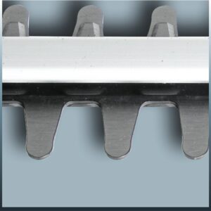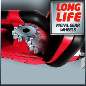 Bei der Entwicklung der Einhell Elektro-Heckenschere GC-EH 4550 stand die komfortable Handhabung bei gleichzeitig hoher Schnittleistung im Vordergrund. Das Herzstück bildet das robuste Metallgetriebe, das auch bei kurzzeitiger Belastung durch dickere Äste nicht sofort an seine Grenzen stößt. Die lasergeschnittenen Messer greifen das Schnittgut effektiv, sodass ein sauberes Trennen ohne Ausfransen der Zweige möglich ist.