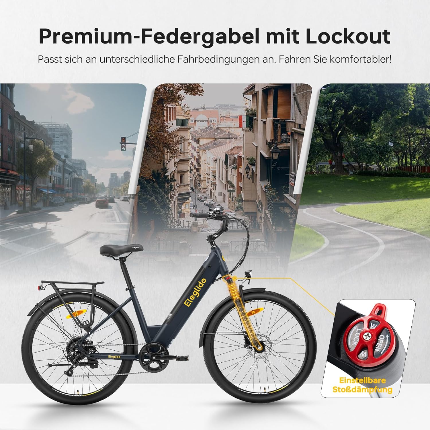 - Regulierbare Federgabel: Die blockierbare Federung absorbiert Stöße auf unebenem Untergrund effektiv und sorgt für ein stabiles Lenkverhalten.