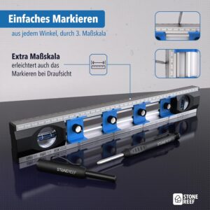 - Doppelte Maßskala: Die Skalierung an der Ober- und Seitenkante ermöglicht ein exaktes Ablesen der Abstände unter verschiedenen Blickwinkeln, was Messfehler bei der Montage minimiert.