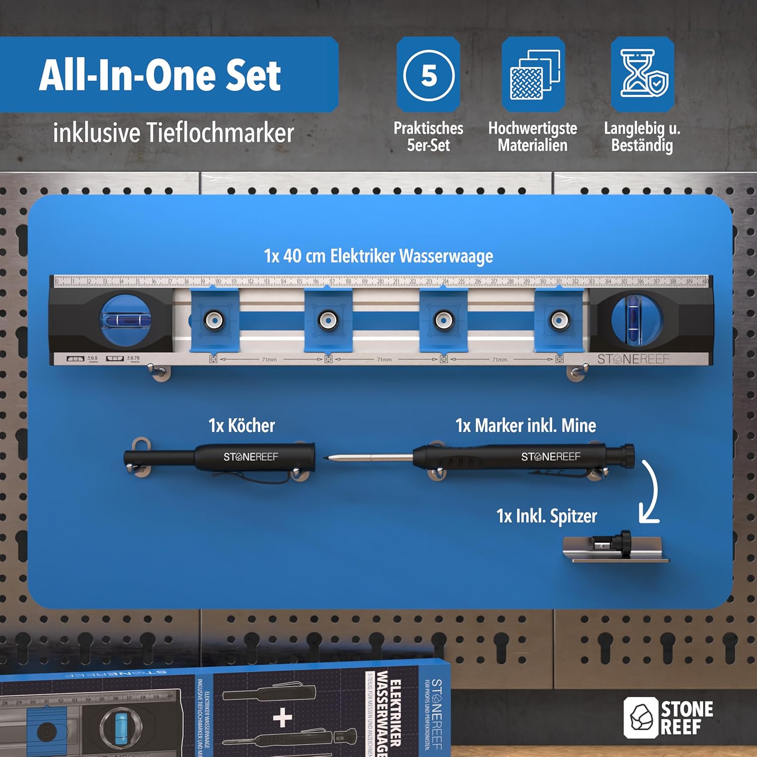 Die Wasserwaage ist als Präzisionswerkzeug konzipiert und unterstützt Sie dabei, Steckdosen exakt und gerade zu montieren. Da die verschiebbaren Bohrlöcher eine direkte Markierung an der Wand ermöglichen, sparen Sie Zeit bei der Installation und erreichen ein professionelles Ergebnis.