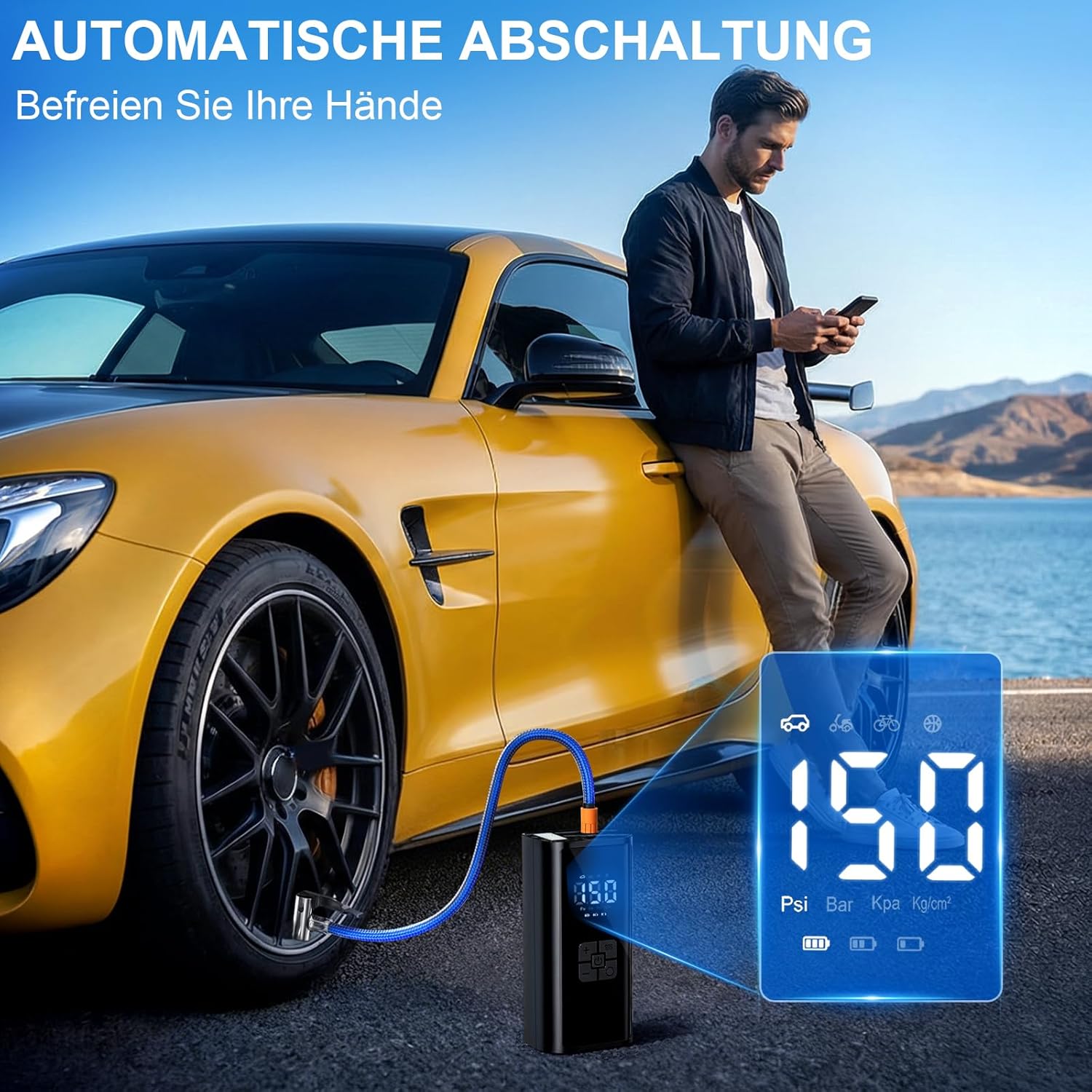 - 【Intelligentes Aufpumpen】Automatischer Stopp bei Erreichen des Zieldrucks (bis 150 PSI, ±1 PSI Genauigkeit). Die fahrradpumpe elektrisch sorgt für sicheres Befüllen.