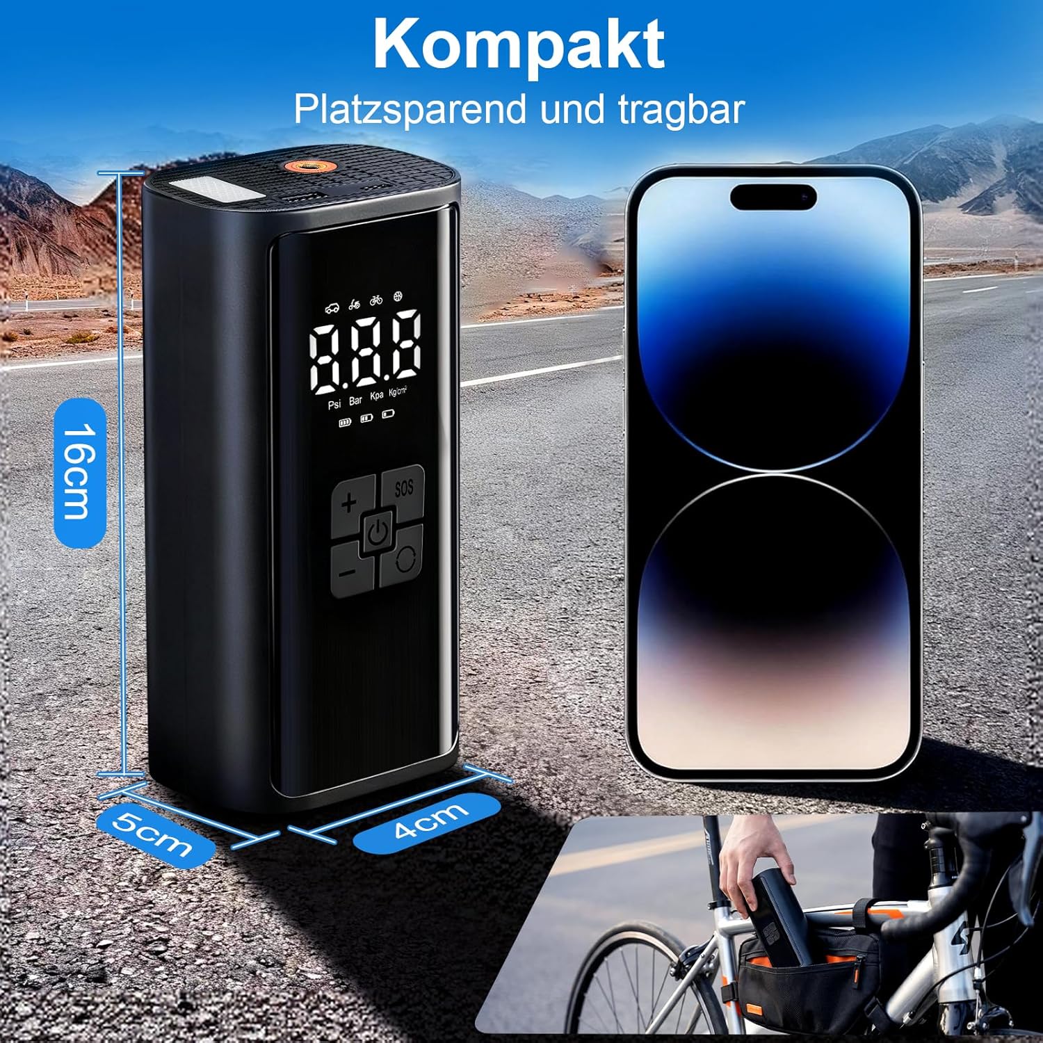 - 【Tragbares Design】Diese elektrische Luftpumpe (16×8×5 cm) passt in jeden Rucksack oder sogar in die Jackentasche. Der Mini Kompressor ist Ihr perfekter Reisebegleiter für Pannen unterwegs.