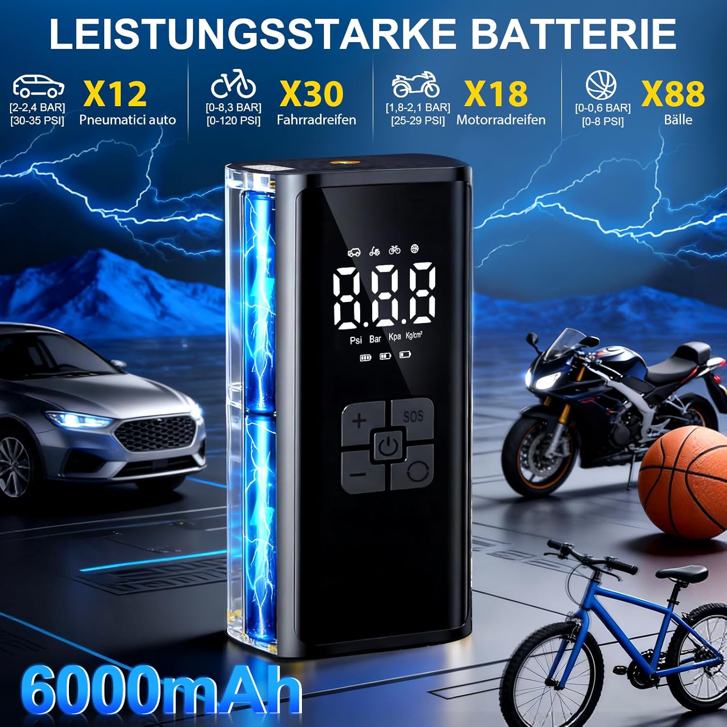 - 【Daten-Display】Digitales LCD zeigt 4 Einheiten: PSI/KPA/BAR/KG/CM². Der akku luftpumpe fahrrad liefert Echtzeit-Daten für präzises Arbeiten.