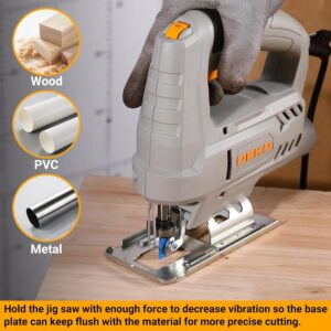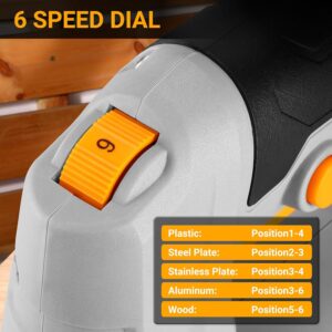 - Variable Geschwindigkeitskontrolle: Mit 0-3000 SPM passt du die Schnittgeschwindigkeit präzise an dein Material an – langsam für Metall, schnell für Holzschnitte