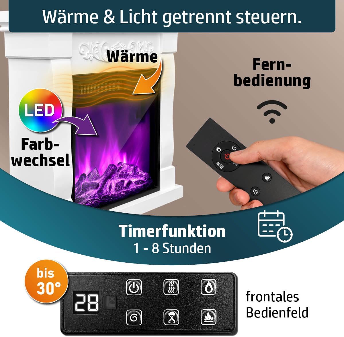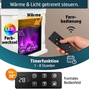 Die Bedienung ist sehr komfortabel, da Sie den Kamin entweder über das versteckte Bedienfeld hinter der Frontklappe oder bequem über die mitgelieferte Fernbedienung steuern können. Mit der Fernbedienung lassen sich neben der Temperatur auch die Timer-Funktion (1-8 Stunden) und die vielfältigen Lichtkombinationen des Flammeneffekts mühelos einstellen.