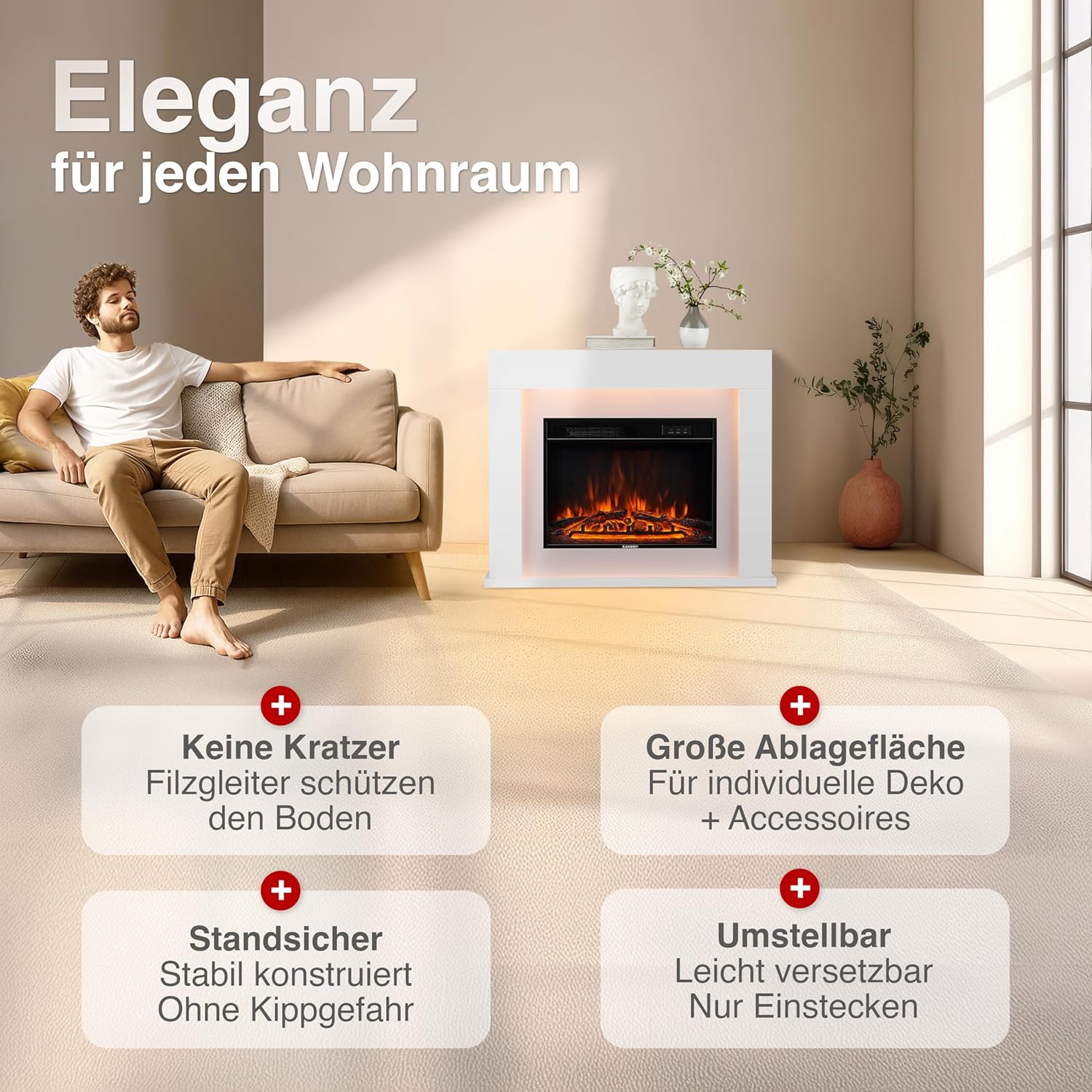 - Plug & Play Inbetriebnahme: Da keine Genehmigungen oder aufwendige Elektroinstallationen nötig sind, wird der Kamin einfach an eine herkömmliche Steckdose angeschlossen und ist sofort einsatzbereit.