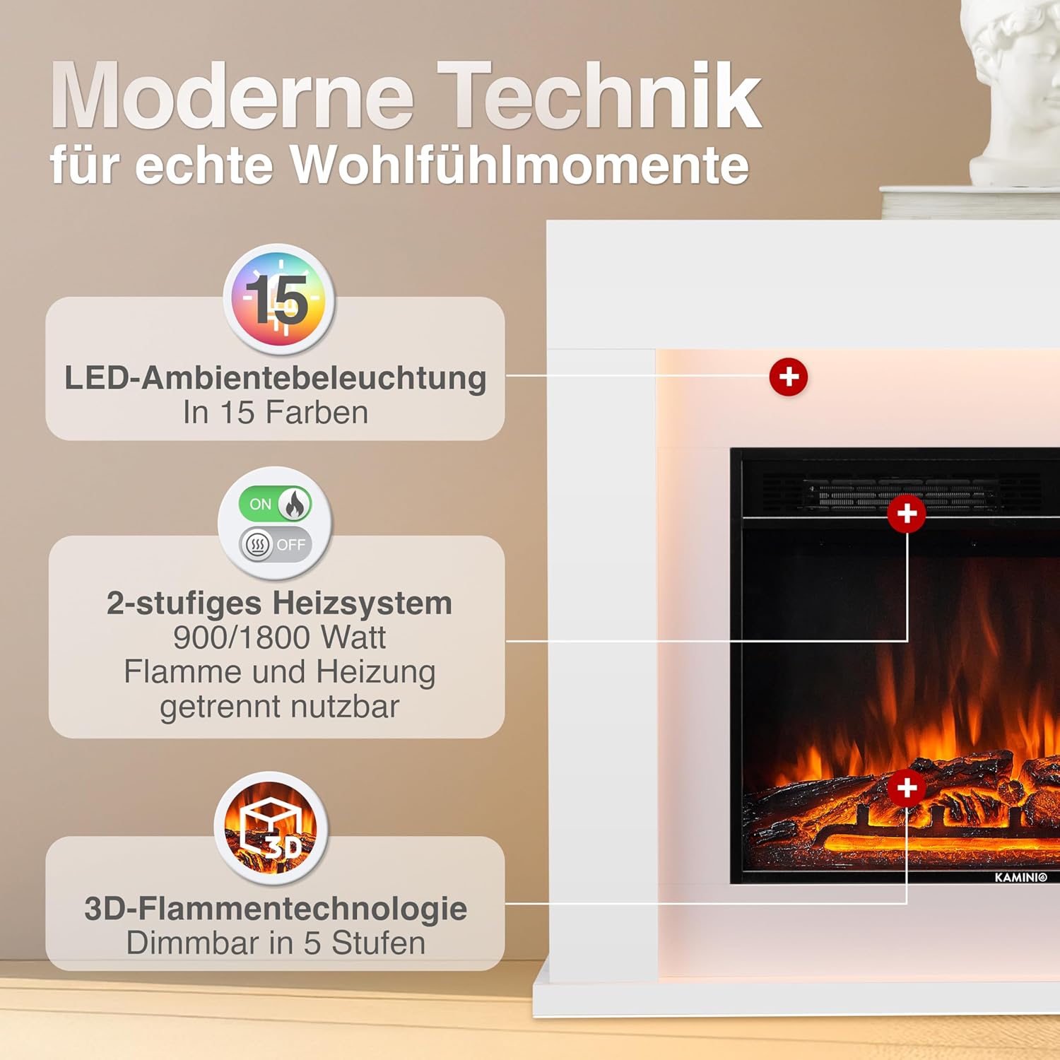 - Energiesparende 3D-Flammentechnologie: Reduziert den Stromverbrauch bei gleichzeitig realistischer Optik für eine gemütliche Arbeitsumgebung.