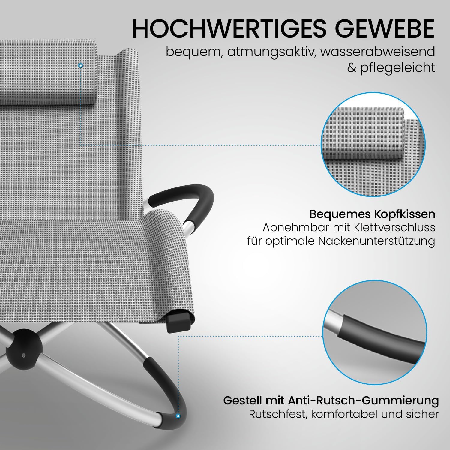 Praktisch durchdacht ist die seitlich angebrachte Tasche. Sie nimmt ein Smartphone, ein Taschenbuch und eine kleine Getränkeflasche auf – alles griffbereit, ohne dass man einen Beistelltisch braucht. Das abnehmbare Kopfkissen lässt sich in der Höhe anpassen und kann bei Nichtgebrauch platzsparend verstaut werden. Das graukarierte Design wirkt modern und unauffällig, passt zu den meisten Gartenmöbeln und zeigt Verschmutzungen nicht so schnell wie einfarbige helle Bezüge.