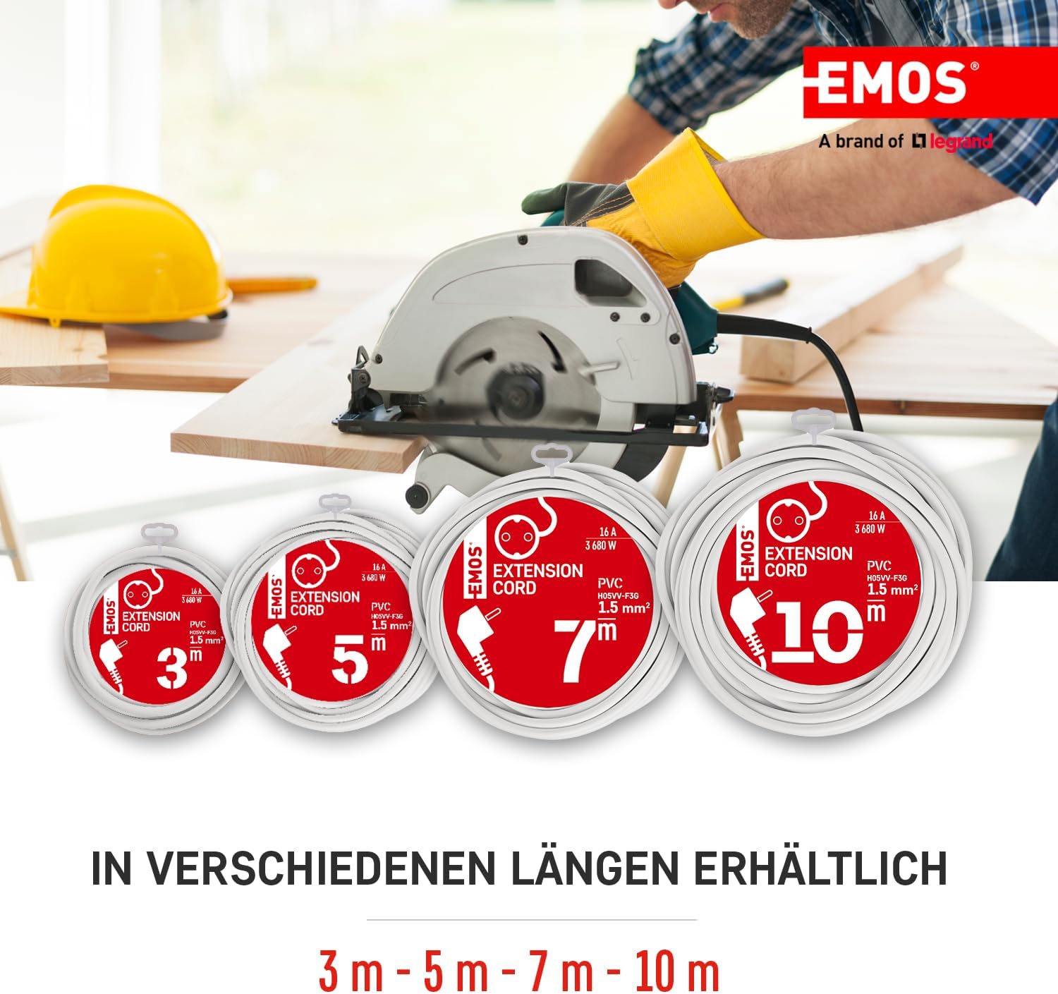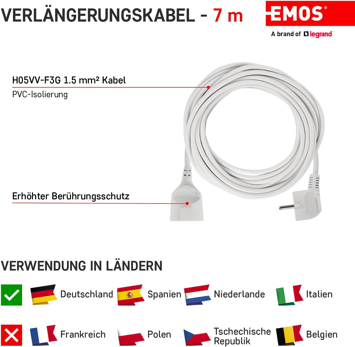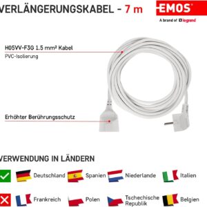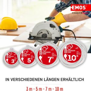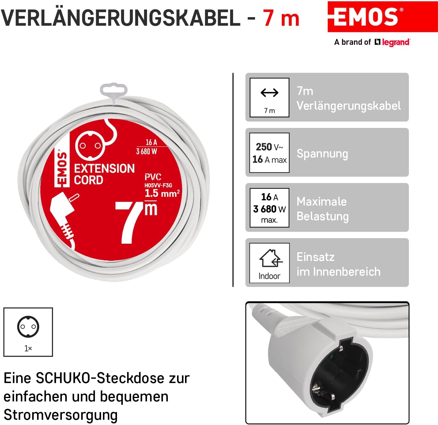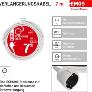 Das EMOS Verlängerungskabel (Modell P0127R) bietet eine zuverlässige Stromverlängerung von exakt 7 Metern. Damit eignet es sich ideal, um Geräte auch in größerer Entfernung zur nächsten Steckdose sicher zu betreiben.