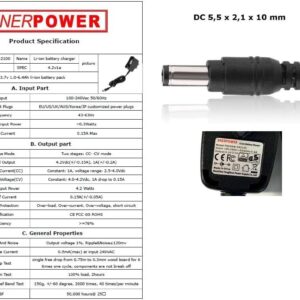 Der Lieferumfang umfasst ein komplettes Set bestehend aus einem Ladegerät sowie dem dazugehörigen Netzkabel mit 5,5 x 2,1 mm Rundstecker. Somit ist alles Notwendige enthalten, um Ihre 3,6V-3,7V Li-Ion-Akkus direkt sicher und effizient aufzuladen.