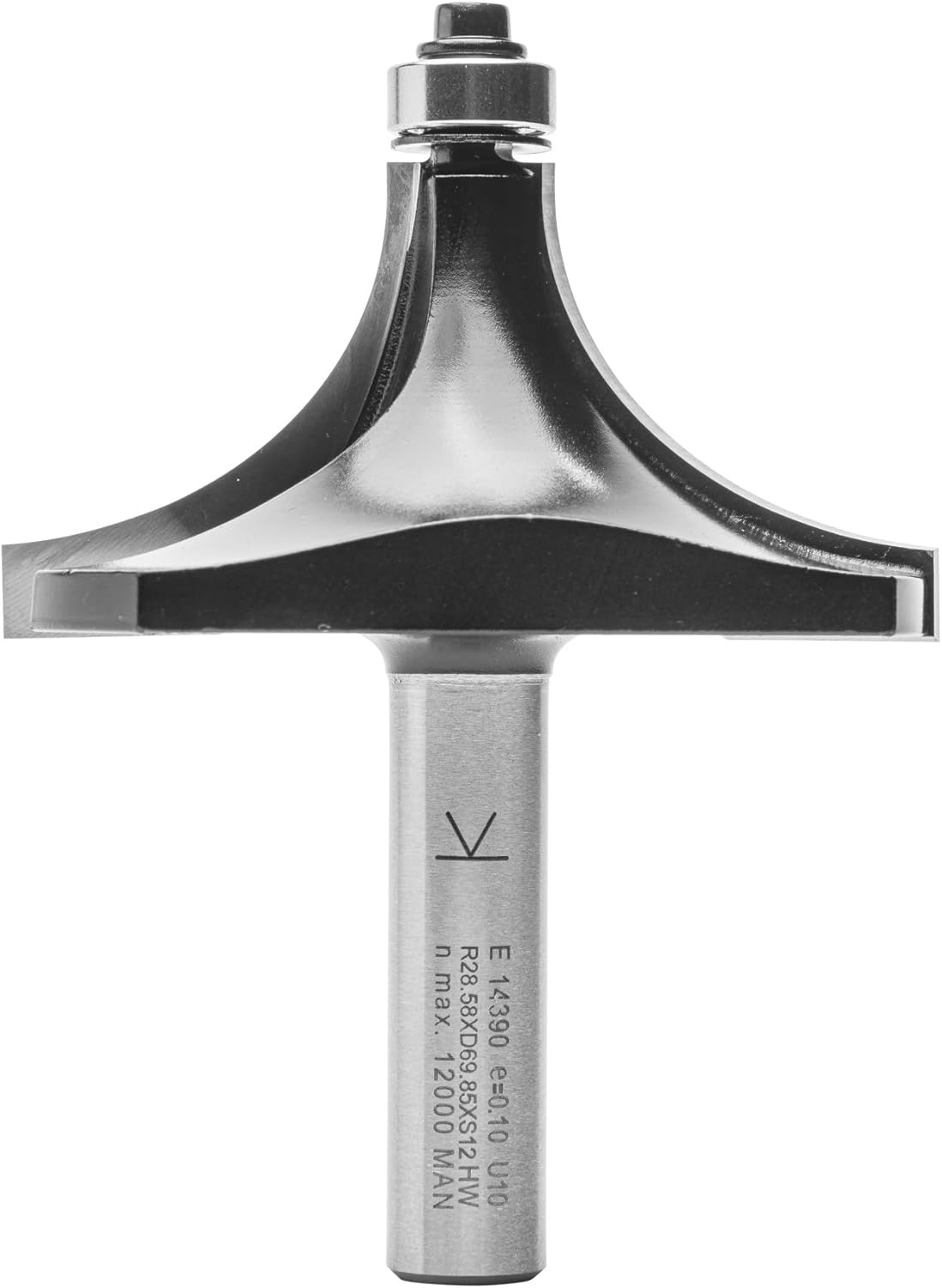 Aus unserer Erfahrung in der Werkstatt ist die Wahl des richtigen Schaftdurchmessers entscheidend. Der 12 mm Schaft gewährleistet eine verwindungsfreie Einspannung in der Spannzange der Fräse. Das integrierte Kugellager dient als verlässlicher Führungspunkt, der den Vorschub entlang des Werkstücks erleichtert. Dennoch bildet die Größe des Fräsers eine physikalische Grenze: Durch den beachtlichen Durchmesser 69,9 mm muss die Drehzahl der Maschine stark reduziert werden, um Unwuchten und eine zu hohe Schnittgeschwindigkeit zu vermeiden.