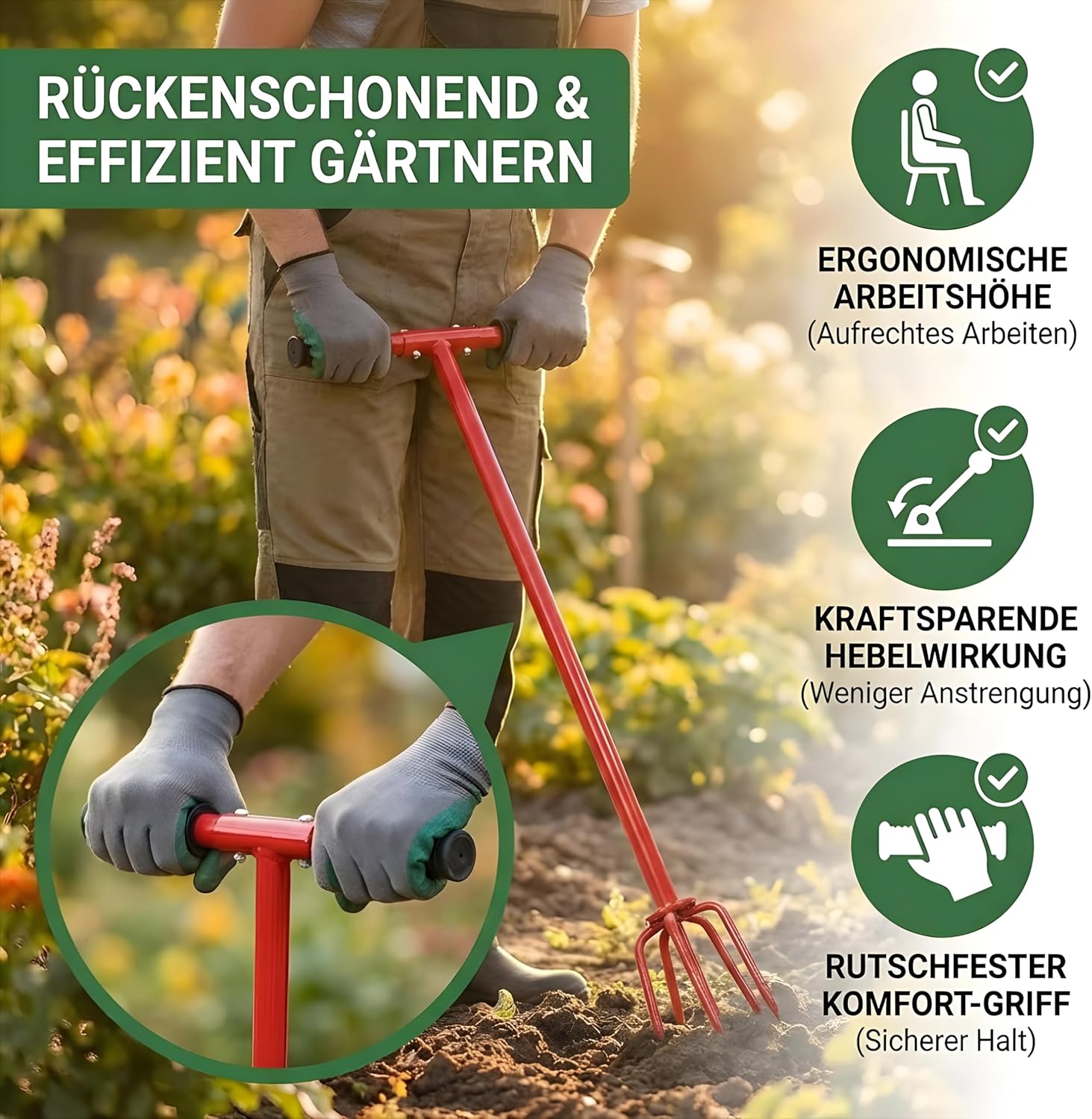 Bringen Sie frischen Schwung in Ihren Garten – Ganz ohne Rückenschmerzen!Kennen Sie das? Der Frühling kommt, die Beete müssen vorbereitet werden, aber der Gedanke an das mühsame Umgraben mit dem Spaten sorgt jetzt schon für Rückenschmerzen. Schluss damit! Mit der 5-Zinken Erdkralle wird die Bodenarbeit nicht nur kinderleicht, sondern macht sogar Spaß.Dieses intelligente Gartengerät nutzt eine einfache Drehbewegung, um den Boden effektiv zu lockern, ohne die wertvollen Erdschichten durcheinanderz