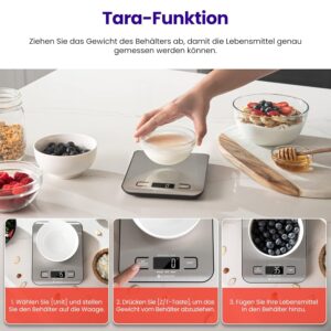 Die Waage bietet Ihnen maximale Flexibilität bei der Zubereitung Ihrer Rezepte, da sie zwischen vier verschiedenen Einheiten variieren kann. Sie können die Messergebnisse wahlweise in Gramm (g), Milliliter (ml), Pfund-Unzen (lb’oz) oder Flüssigunzen (floz) anzeigen lassen. Dies macht die digitale Edelstahlspeisewaage zu einem vielseitigen Helfer für unterschiedliche Messanforderungen.