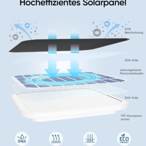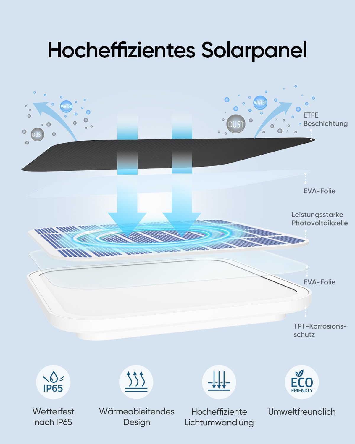 • Unabhängige Energieversorgung: Das mitgelieferte Solarpanel lädt die Akkus effizient nach, sodass manuelle Ladeintervalle bei optimaler Ausrichtung nahezu entfallen.