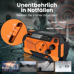 - FM/AM Notradio mit ausziehbarer Antenne – Ermöglicht den Empfang lokaler Radiosender und wichtiger Durchsagen, z. B. bei Unwettern, Stromausfällen oder in abgelegenen Gebieten, in denen Mobilfunk oder Internet nicht zuverlässig verfügbar sind.