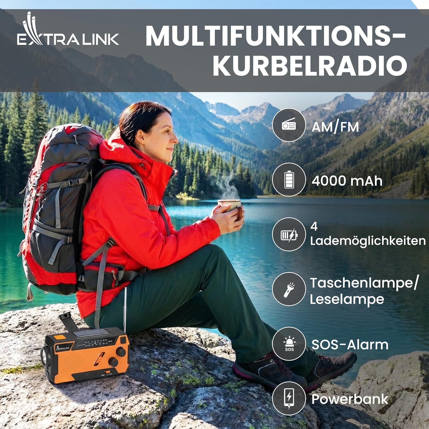 Sehr zufrieden mit dem Extralink Kurbelradio Notfallradio mit Solar & Kurbel, Ladefunktion 4000 mAh mit integrierten Ladekabeln, FM/AM Radio, LED Taschenlampe & Leselicht, SOS Alarm – für Blackout, Camping & Outdoor! Erfüllt alle Erwartungen.