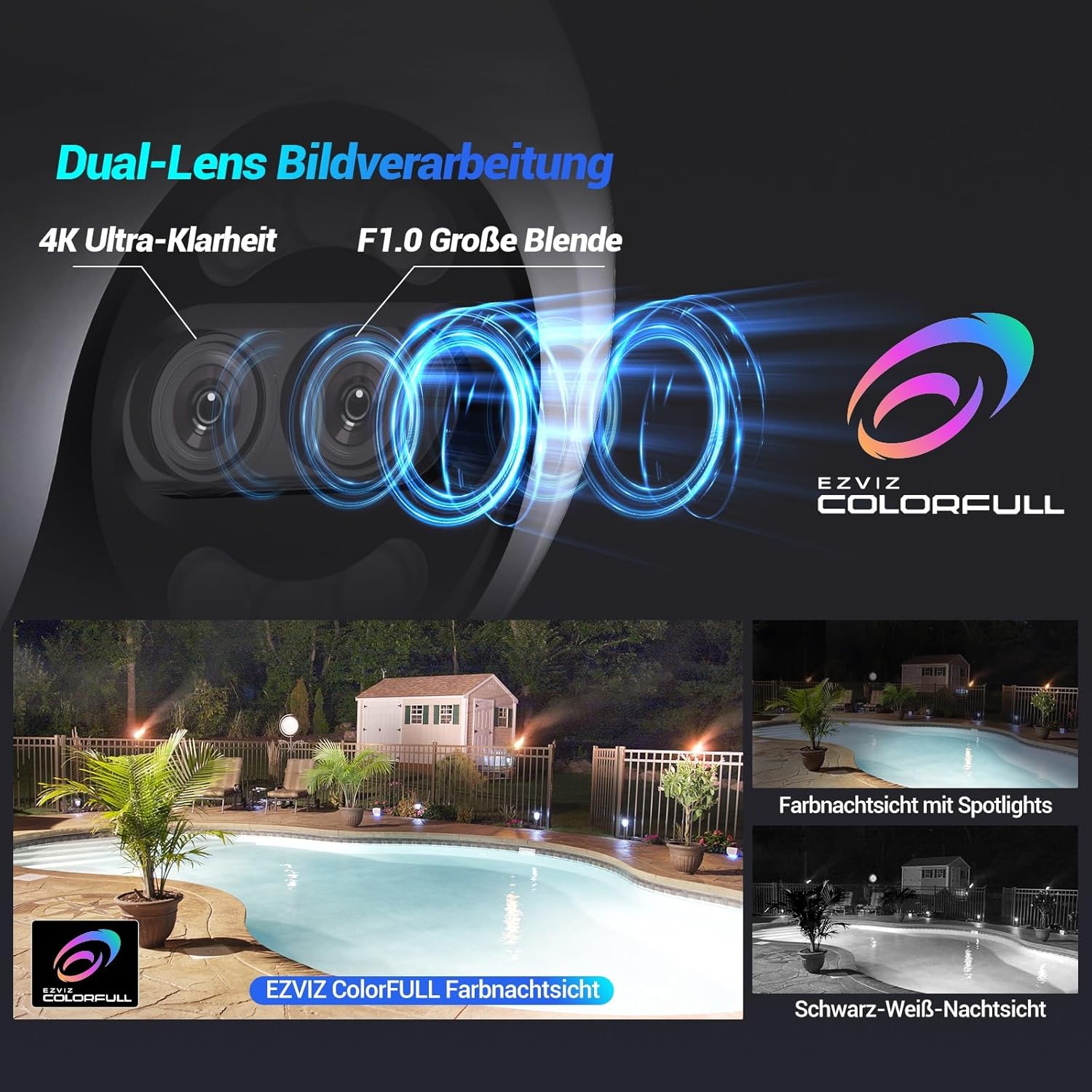 Bei dieser EZVIZ-Kamera hat man den großen Vorteil, dass zwei Objektive Hand in Hand arbeiten. Während das eine Objektiv die 4K-Aufnahmen für die Details schießt, kümmert sich das zweite mit seiner großen F1.0-Blende um die Lichtausbeute. In der Praxis zeigt sich, dass du damit eine echte Farbnachtsicht hinbekommst, ohne dass ständig ein greller Scheinwerfer angehen muss – das wirkt deutlich unauffälliger und natürlicher.
