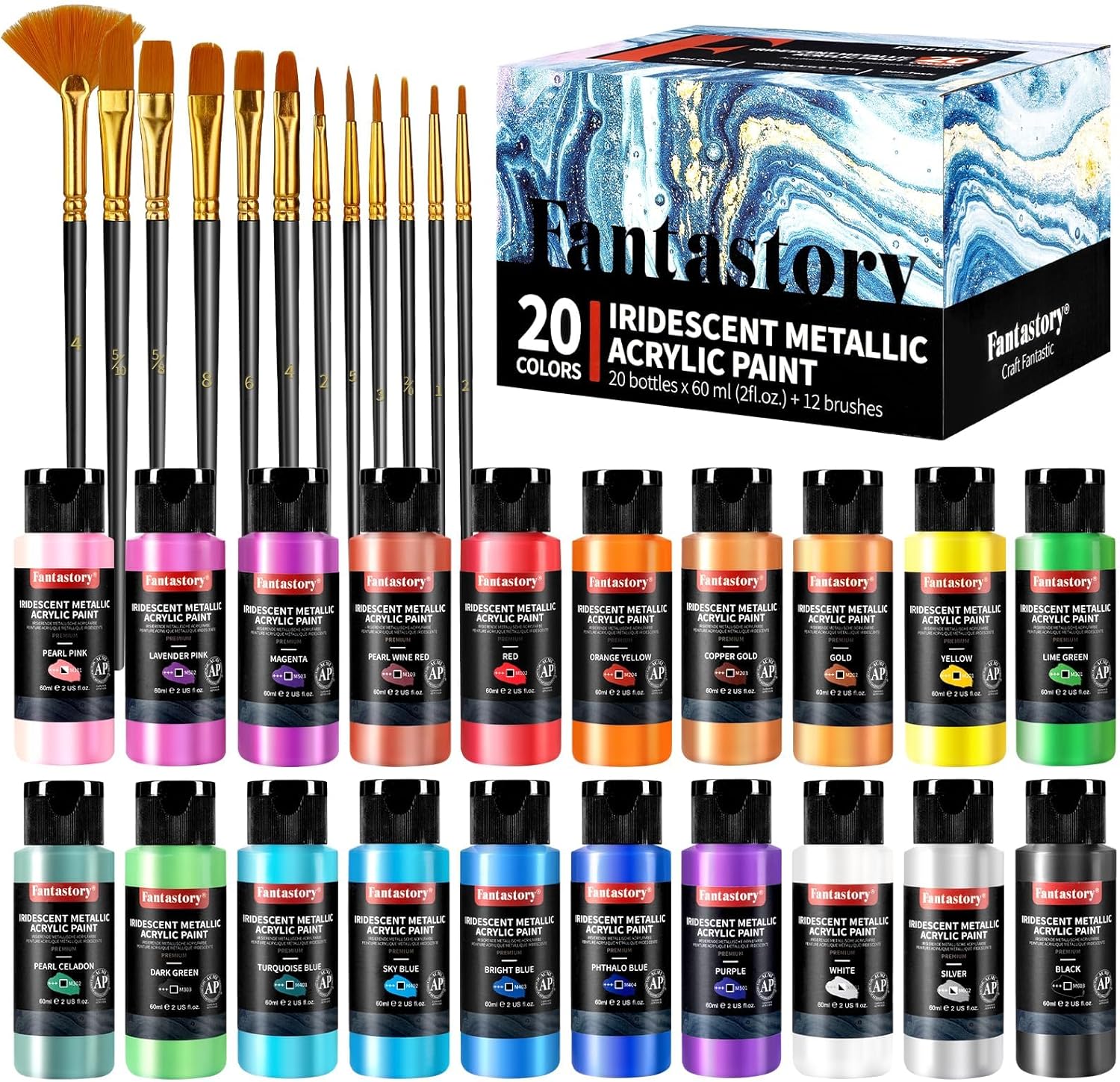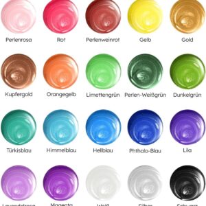 Das Set enthält insgesamt 20 verschiedene Metallic-Farben, die eine breite Palette an kreativen Möglichkeiten bieten. Jede einzelne Farbe ist in einer 60-ml-Einheit enthalten, was ausreichend Material für zahlreiche umfangreiche Malprojekte bietet.