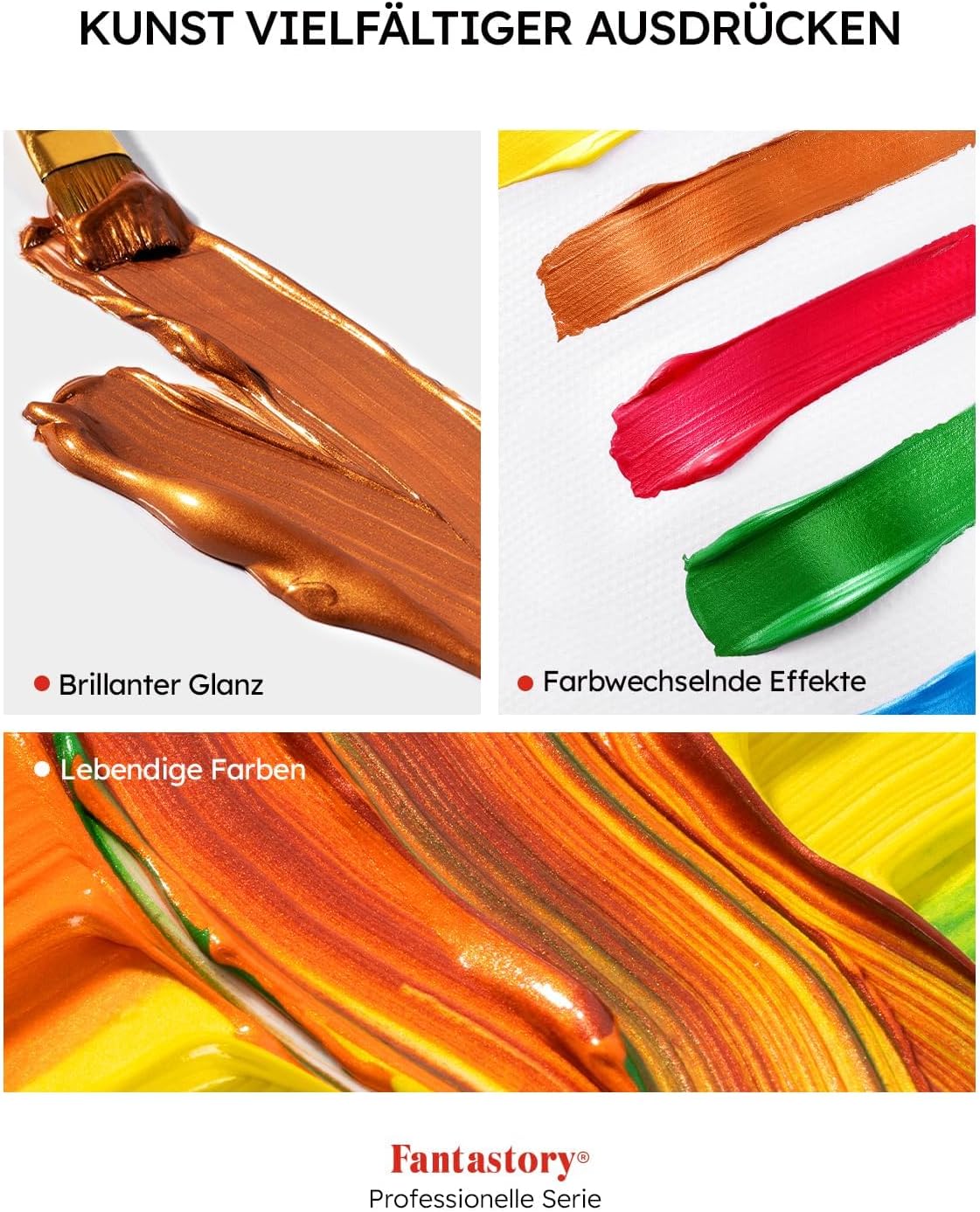 Das Fantastory Acrylfarben Set Met bietet eine präzise kontrollierbare Viskosität, die sowohl Anfängern als auch erfahrenen Anwendern entgegenkommt. Die pastöse Eigenschaft der Farben erlaubt es, Strukturen aufzubauen, ohne dass die Farbe verläuft. Dank der hohen Lichtbeständigkeit bleiben die brillanten Metallic-Töne auch bei direkter Sonneneinstrahlung über lange Zeit unverändert und bleichen nicht aus. Dies macht das Set zur idealen Wahl für Objekte, die in Schauräumen oder im Außenbereich dauerhaft präsentiert werden sollen.