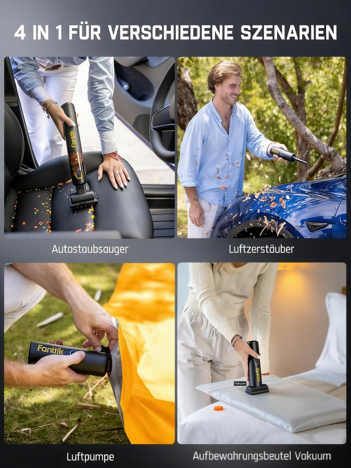 - 4-in-1 Multifunktionalität: Das Gerät vereint Saugen, Blasen, Aufblasen und Vakuumieren, was es zu einem extrem vielseitigen Helfer für unterschiedliche Aufgaben macht.