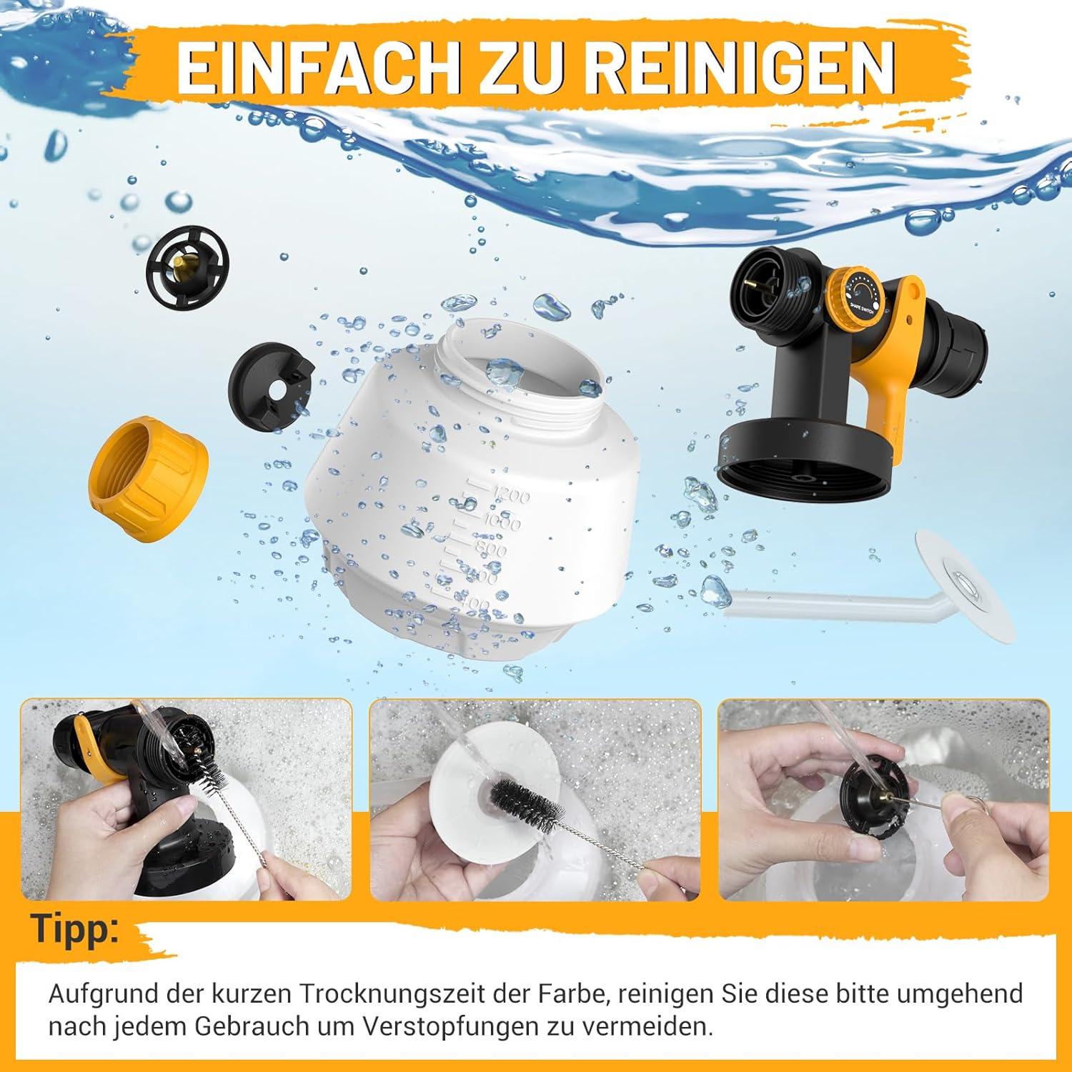 - Großzügiges Behältervolumen: Der 1200ml Tank minimiert die Pausen durch Nachfüllen, sodass du größere Flächen am Stück bearbeiten kannst.