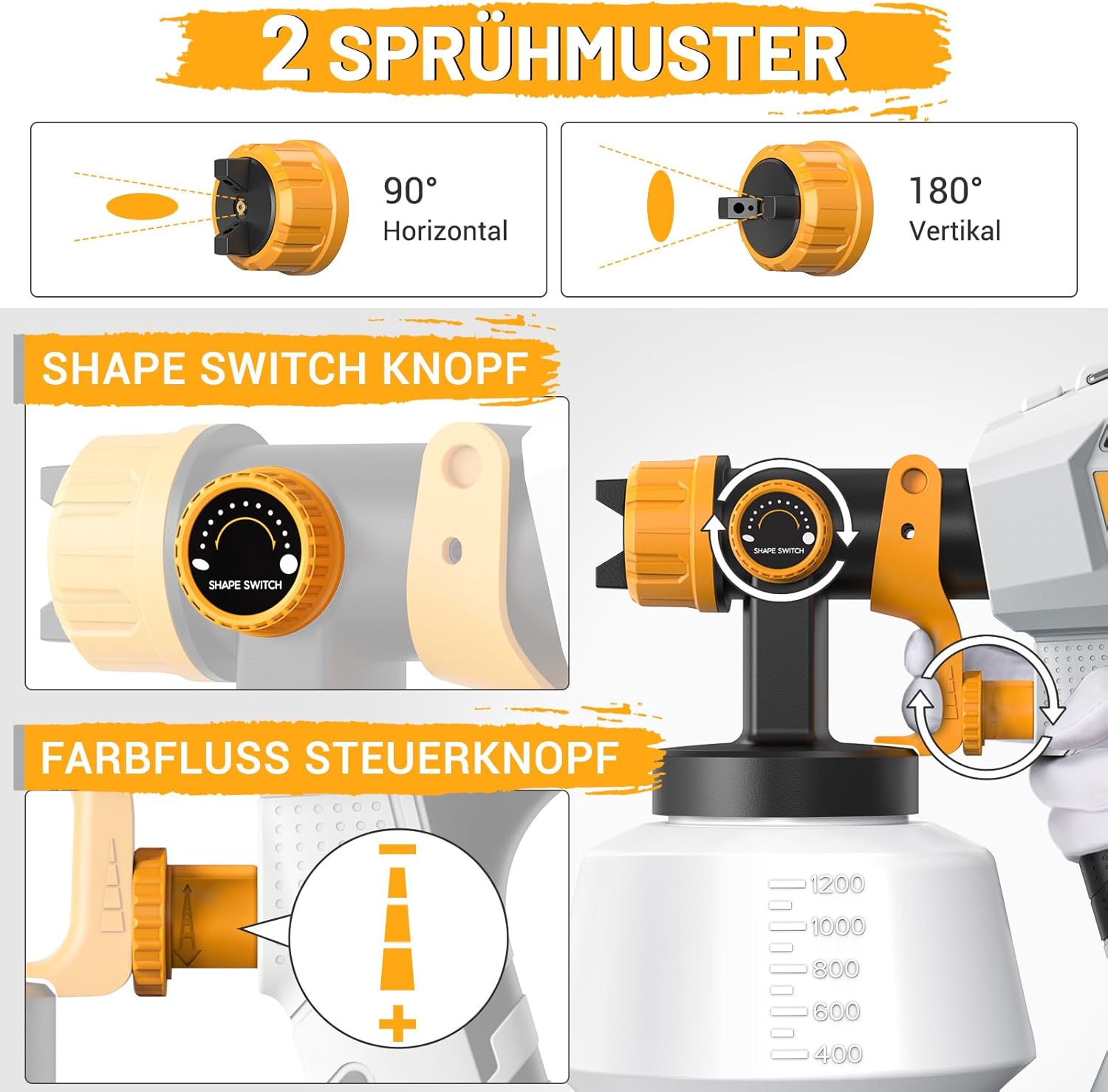 - Präzise Kontrolle: Über den einstellbaren Durchflussregler und die variablen Sprühmuster (horizontal/vertikal) lässt sich die Farbmenge exakt dosieren, was Materialverschwendung verhindert.