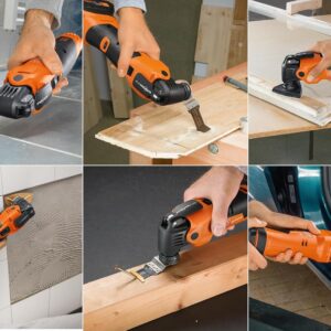 Dieses Multitool ist der Allrounder für Schreiner, Innenausbauer und ambitionierte Renovierer. Besonders effizient arbeitet es beim bündigen Abschneiden von Türzargen, dem Ablängen von Fußleisten oder beim Ausschneiden von Ausschnitten in Gipskarton- und Holzplatten. Durch die E-Cut-Sägeblätter erreichst du saubere Schnitte in Holz, Kunststoff und Verbundwerkstoffen.