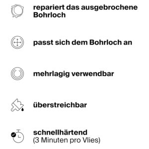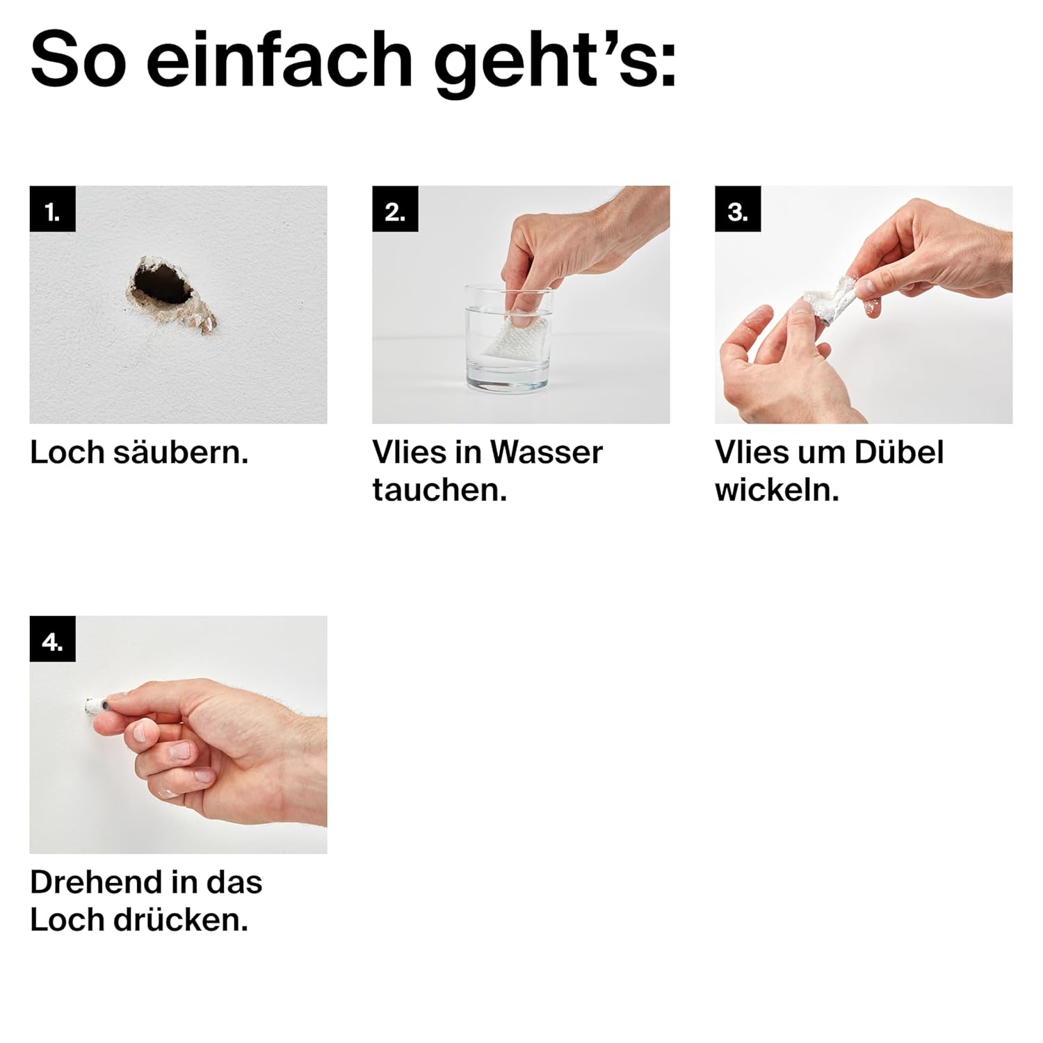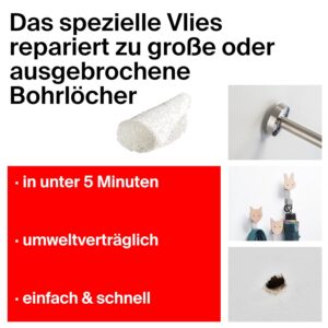• Schnell & zuverlässig: Das Reparaturvlies hilft dabei, ausgerissene, unsaubere oder zu große Bohrlöcher aufzufüllen, damit ein Dübel ohne erneutes Bohren in das Loch eingesetzt werden kann