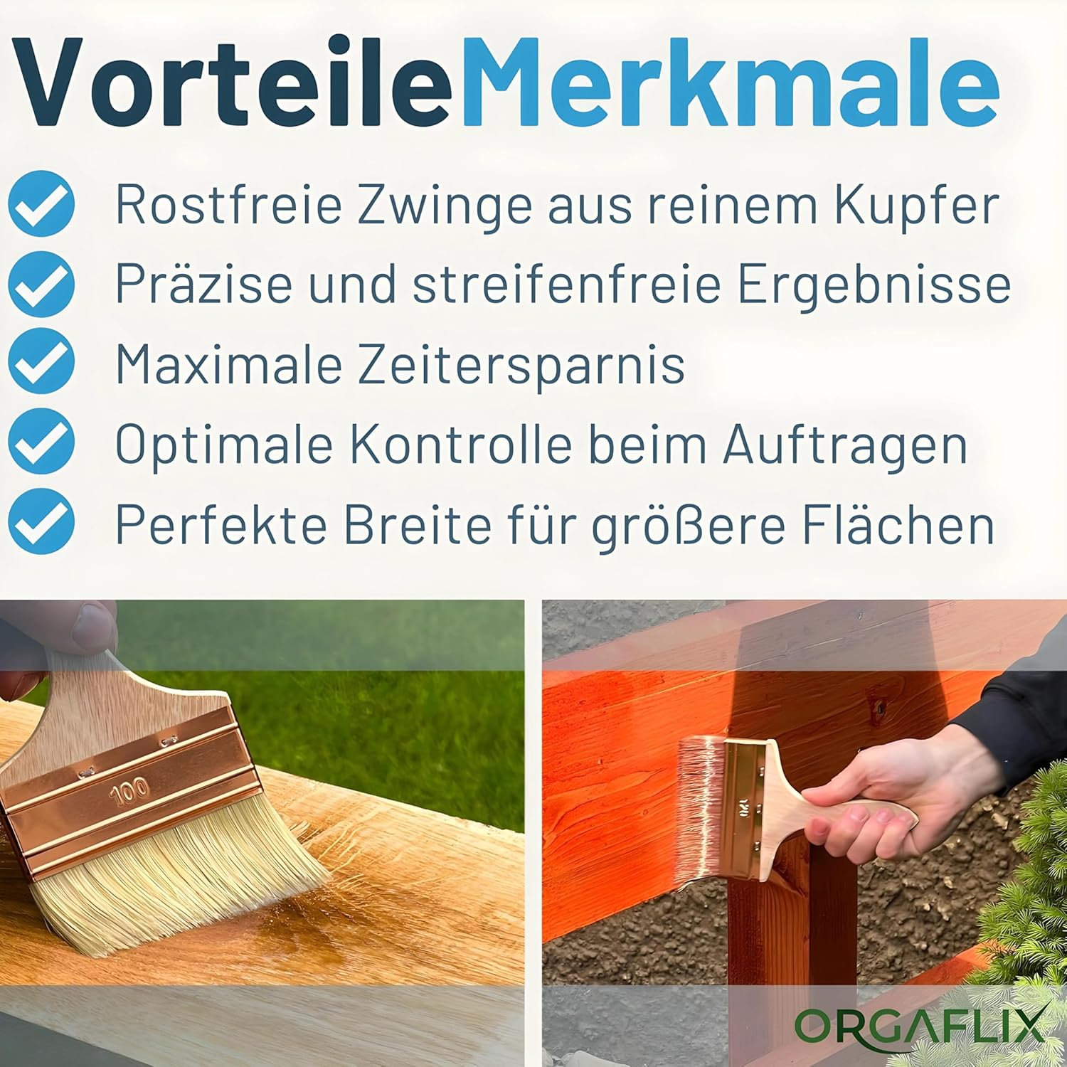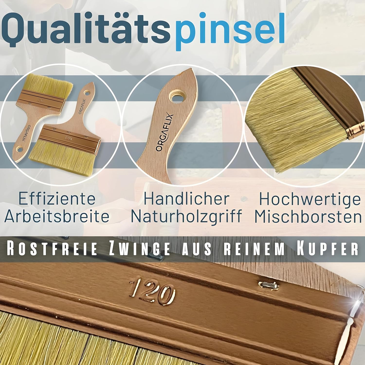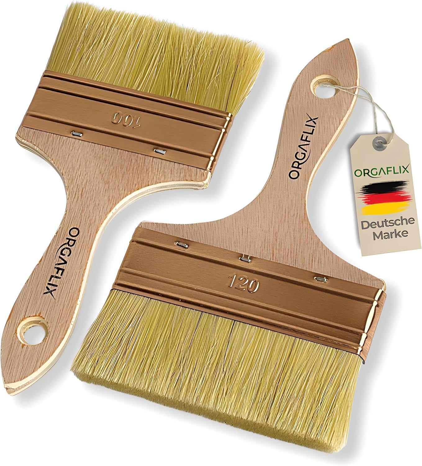 Das ORGAFLIX Flächenstreicher Set besteht aus zwei breiten Pinseln, die speziell für flächige Anstricharbeiten entwickelt wurden. Die Borstenmischung mit 90% Tops – also besonders feinen Borstenspitzen – sorgt für eine gleichmäßige Farbverteilung ohne sichtbare Pinselstriche. Im Gegensatz zu billigen Pinseln mit niedrigerem Tops-Anteil entstehen hier keine Streifen oder Nasen, die aufwendiges Nacharbeiten erfordern würden.