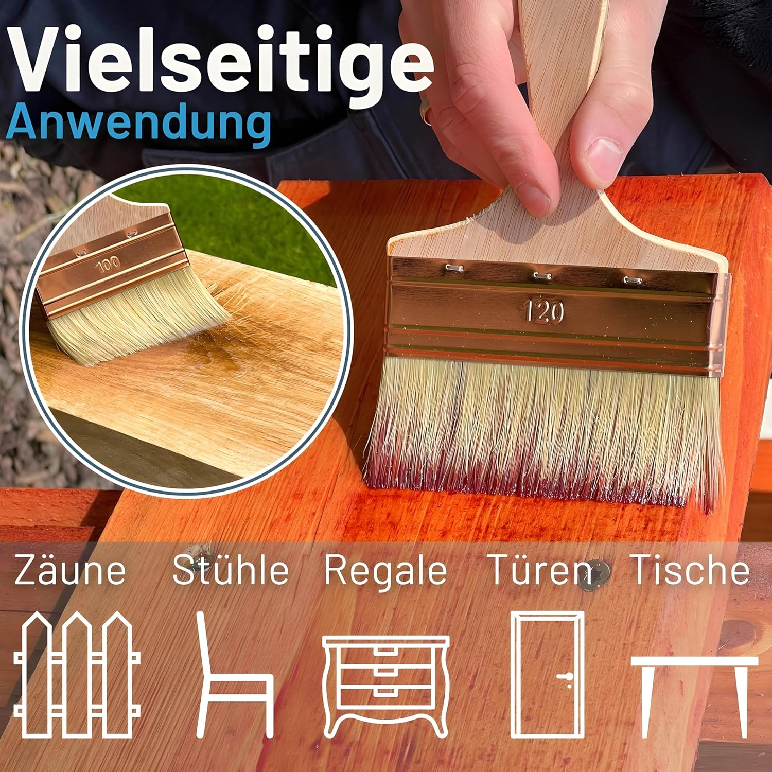 - • Zwei Breiten (100mm + 120mm) ermöglichen zügiges Arbeiten auf großen Flächen wie Türen, Zäunen oder Terrassenböden – spart bis zu 40% Arbeitszeit gegenüber Standard-Pinseln