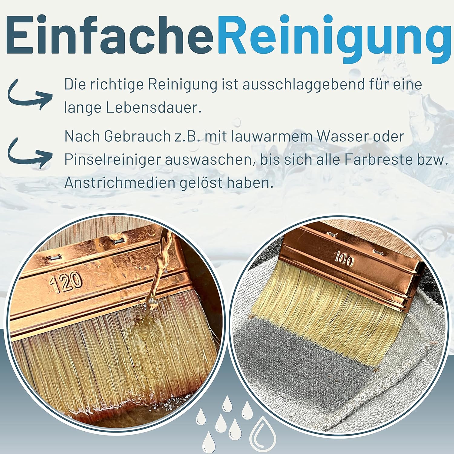 - • Nach jedem Gebrauch sofort mit Wasser und Seife (bei wasserbasierten Farben) oder geeignetem Verdünner (bei Ölen/Lacken) gründlich auswaschen, bis keine Farbreste mehr sichtbar sind