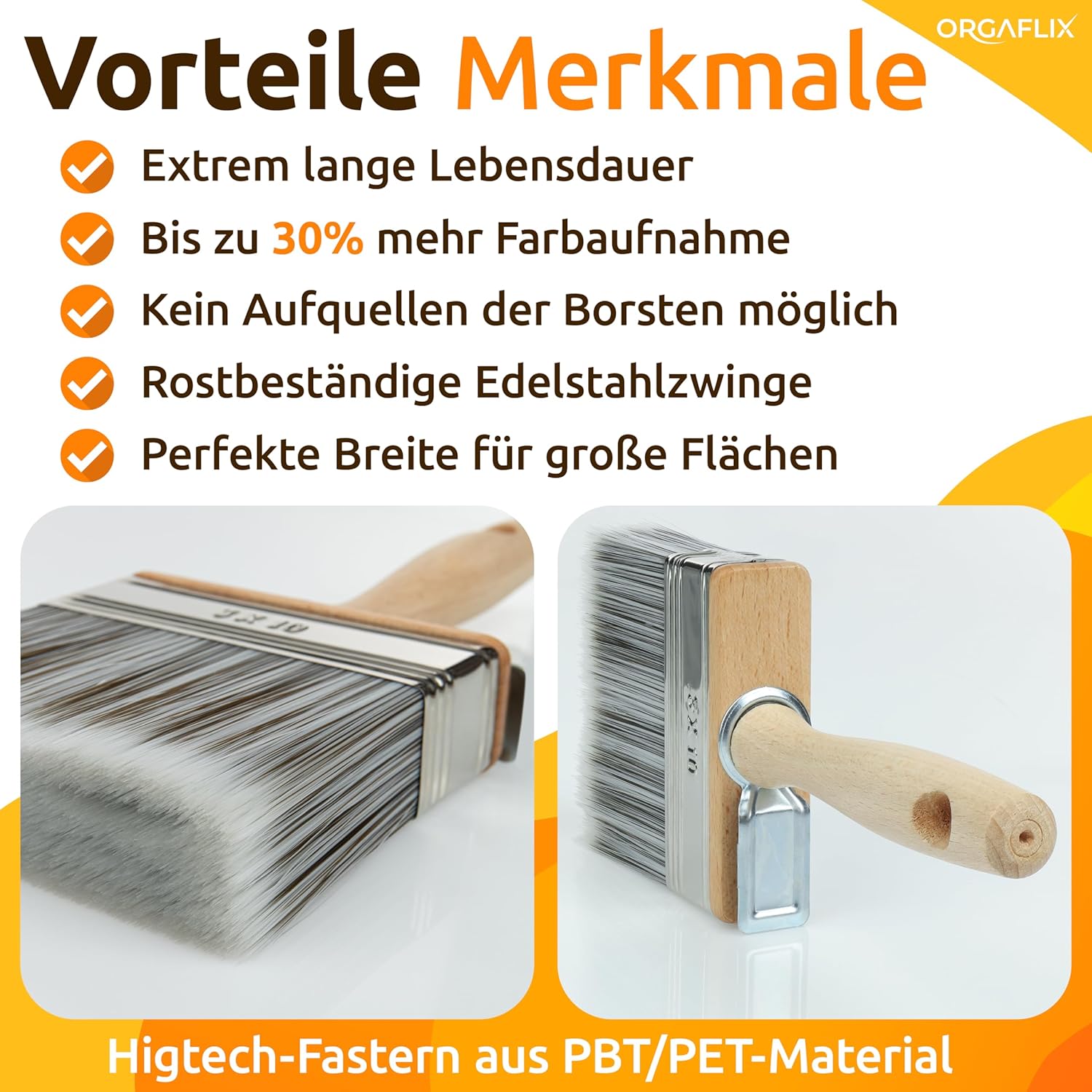 Der ORGAFLIX Flächenstreicher nutzt innovative Hightech-Fasern aus einer PBT/PET-Mischung, die für besonders feine und perfekte Lackoberflächen sorgen. Zudem ist das Produkt durch modernste Verarbeitung bis zu 6-mal länger verwendbar als herkömmliche Malerpinsel.