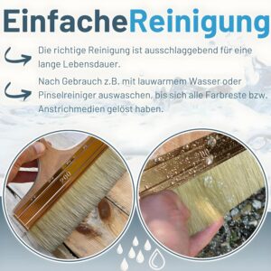 - Nach Gebrauch: Reinige den Pinsel sofort nach Abschluss der Arbeiten gründlich in lauwarmem Wasser unter Zusatz von etwas mildem Spülmittel.