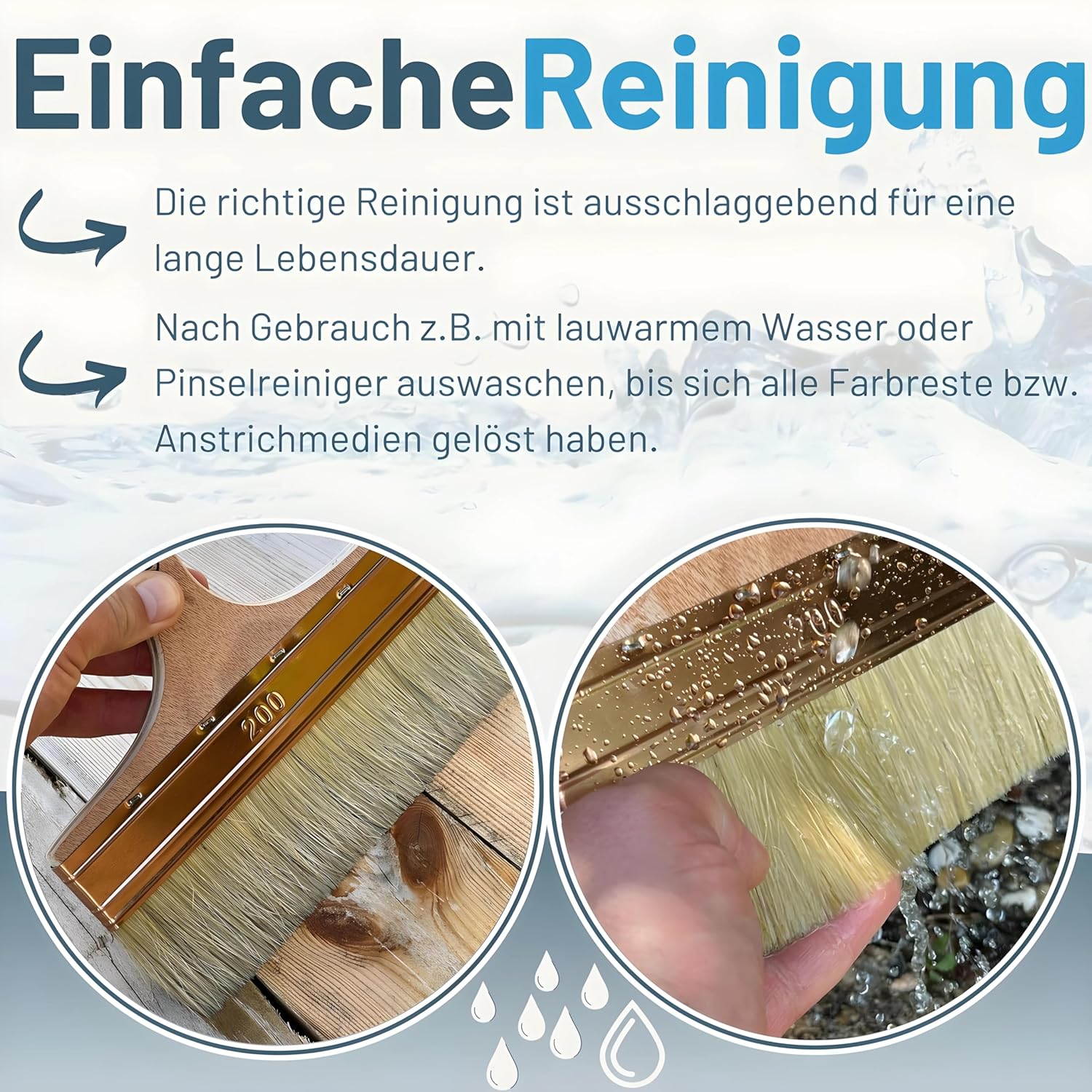 Aus unserer Erfahrung in der Anwendung ist der Naturholzgriff ein entscheidendes Plus. Da dieser unlackiert ist, bietet er auch mit schwitzigen Händen oder Handschuhen einen exzellenten Grip. Dies verhindert ein Verrutschen während des Streichens. Wir setzen den Flächenstreicher bevorzugt dort ein, wo Zeit und Fläche die primären Faktoren sind. Für Filigranarbeiten ist die Breite von 200mm jedoch nicht ausgelegt – hier solltest du auf spezialisierte Kantenpinsel zurückgreifen.