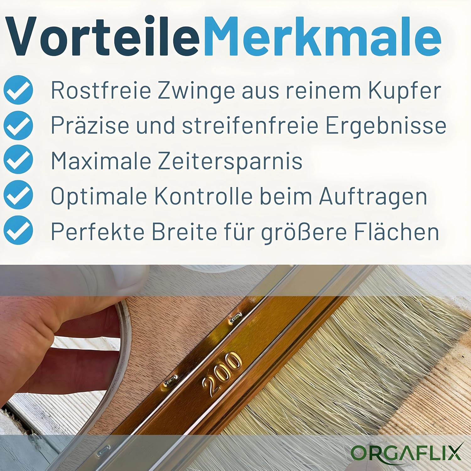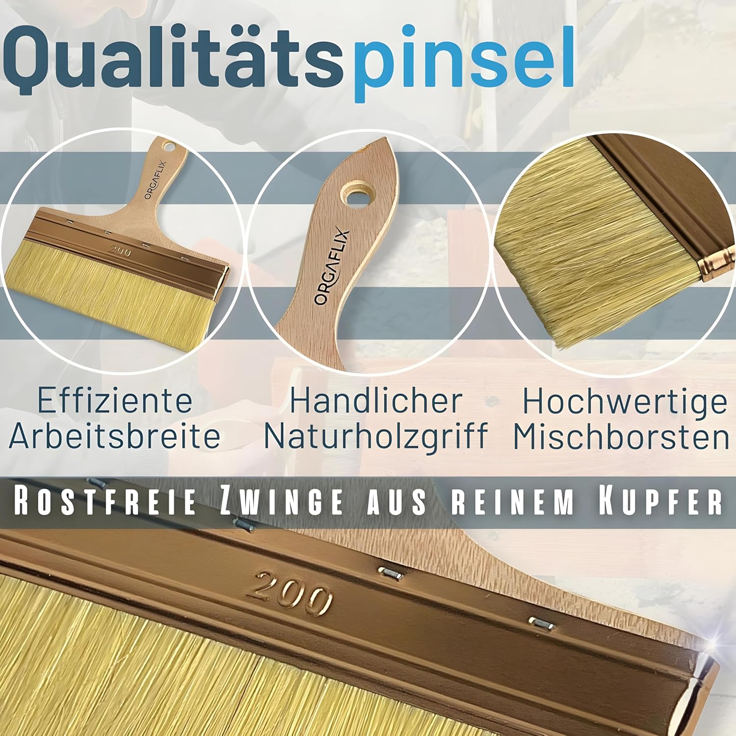 Für ein optimales Ergebnis bei Lackierungen empfiehlt sich eine hochwertige Borstenmischung, wie sie beim ORGAFLIX Flächenstreicher verwendet wird. Dank des Anteils von 90 % Tops sorgt der Pinsel für ein feines und streifenfreies Oberflächenfinish.