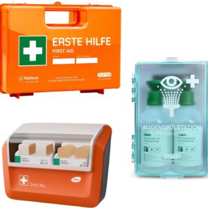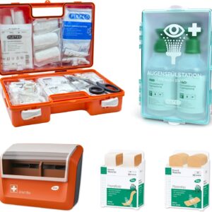 - Regelmäßige Prüfung: Prüfe alle 6 Monate, ob der Pflasterspender nachgefüllt werden muss und ob die Siegel der Augenspülflaschen intakt sind.